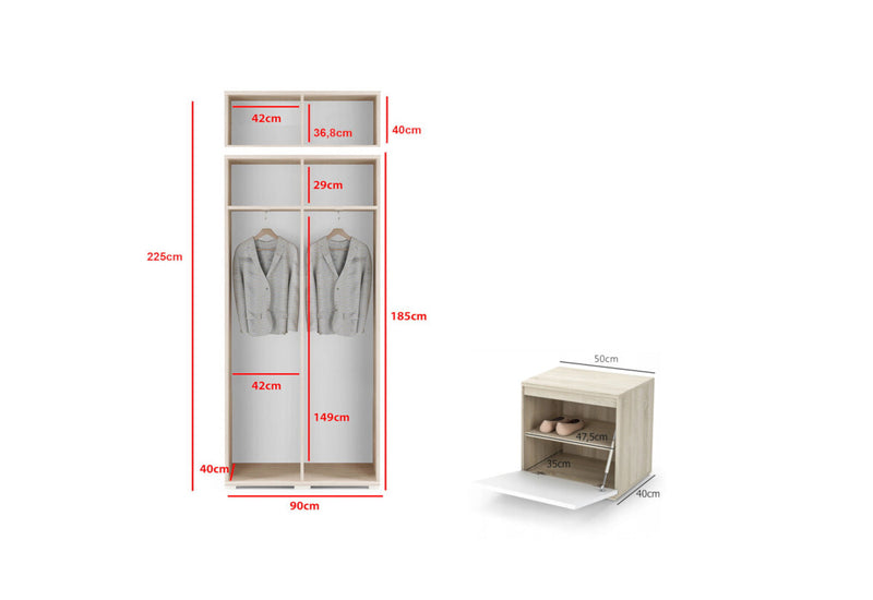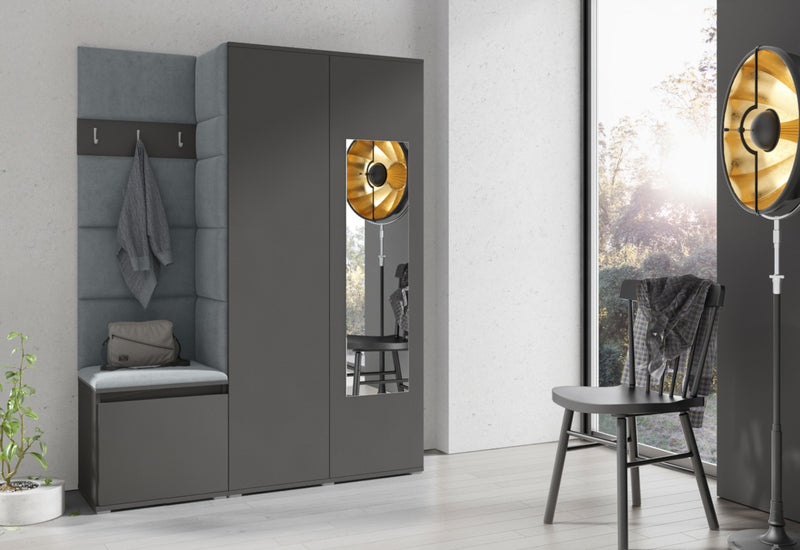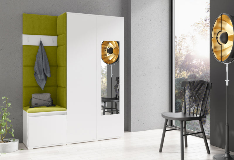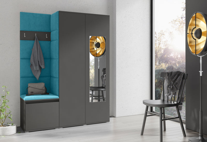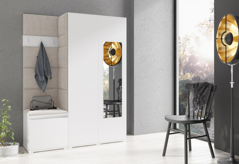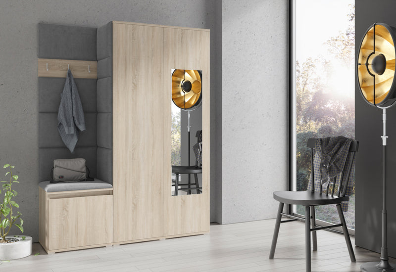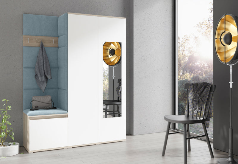 Predsieňová stena EUGENIO 11. Moderné prevedenie v atraktívnom dizajne. Vyrobená je z kvalitného lamina s ABS hranou. Tá chráni materiál pred mechanickým poškodením a vlhkosťou. Súčasťou predsieňovej steny sú čalúnené panely, ktoré sa lepia na stenu. Ďalej obsahuje skriňu s poličkou a tyčou na ramienka, vešiak a botník s poličkou. Predsieňová stena stojí na nižších strieborných nožičkách, ktoré dodávajú stabilitu a pevnosť. Na výber máte z viacerých dekorov a viacerých druhov čalúnenia.