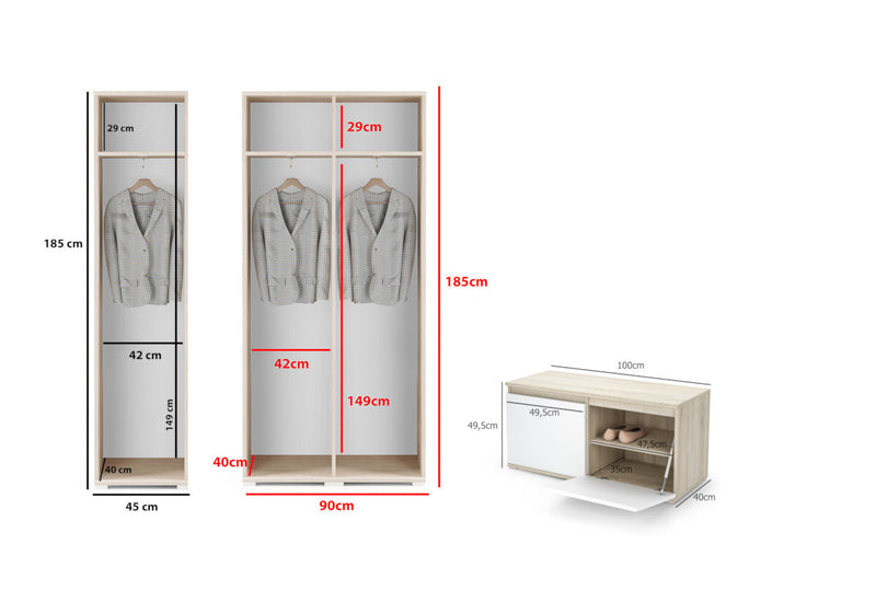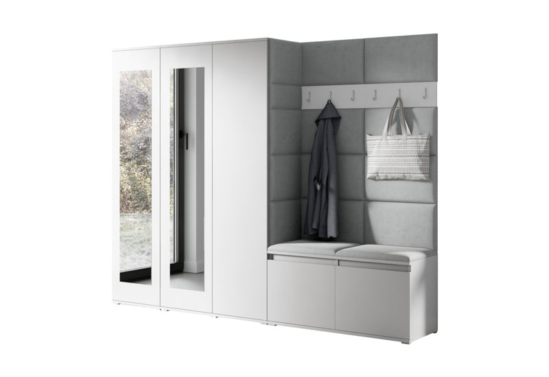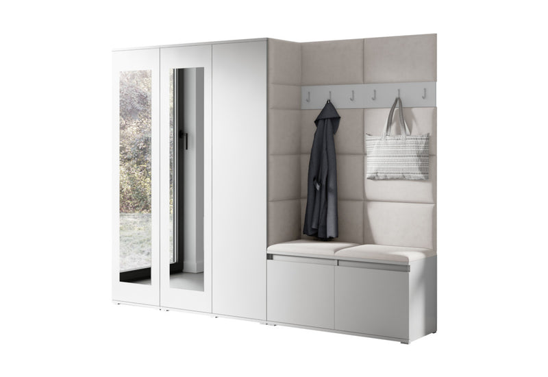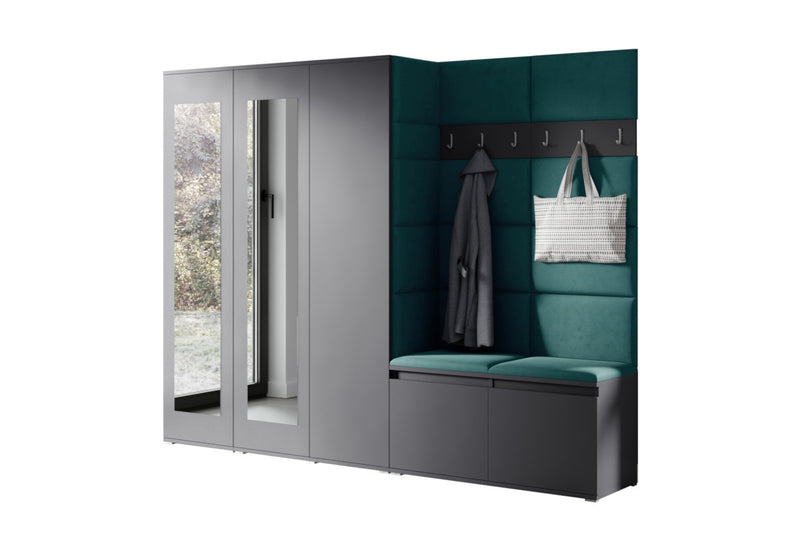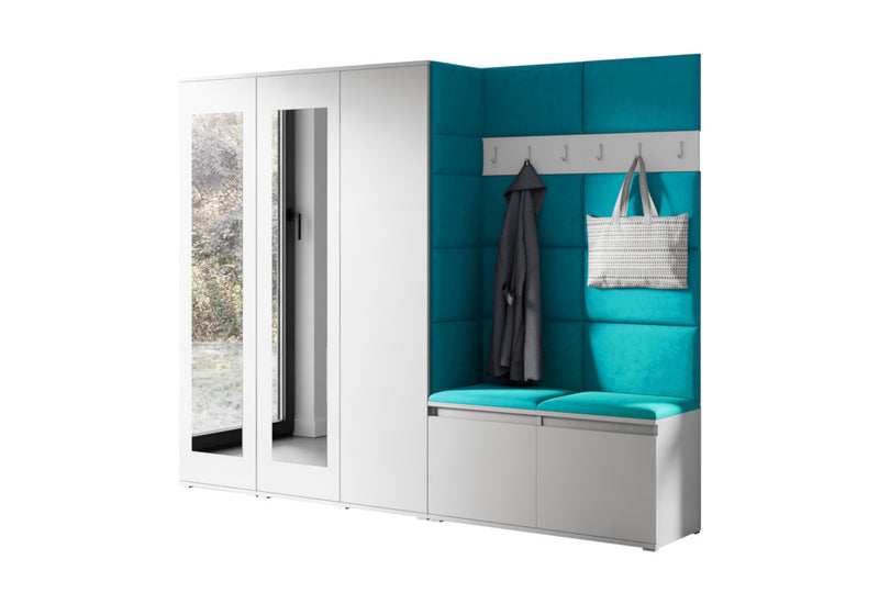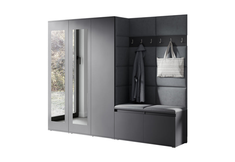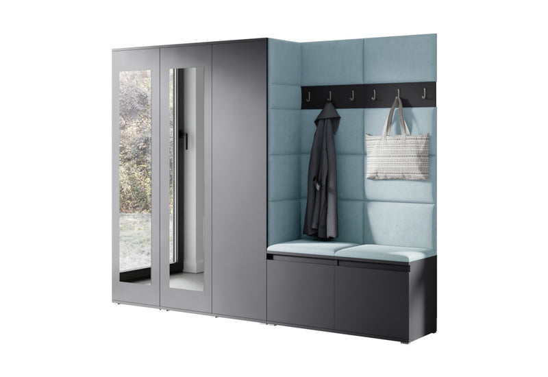 Predsieňová stena EUGENIO 15. Moderné prevedenie v atraktívnom dizajne. Vyrobená je z kvalitného lamina s ABS hranou. Tá chráni materiál pred mechanickým poškodením a vlhkosťou. Súčasťou predsieňovej steny sú čalúnené panely, ktoré sa lepia na stenu. Ďalej obsahuje skriňu s poličkou a tyčou na ramienka, vešiak a botník s poličkou. Predsieňová stena stojí na nižších strieborných nožičkách, ktoré dodávajú stabilitu a pevnosť. Na výber máte z viacerých dekorov a viacerých druhov čalúnenia.