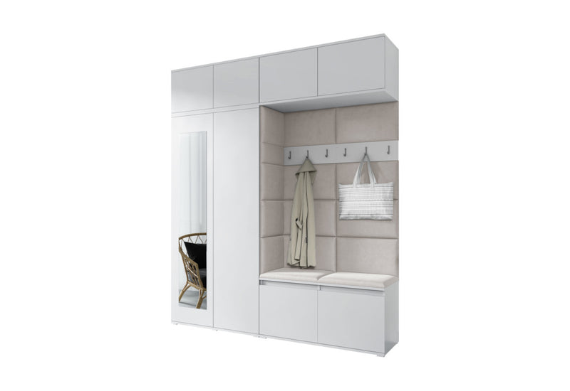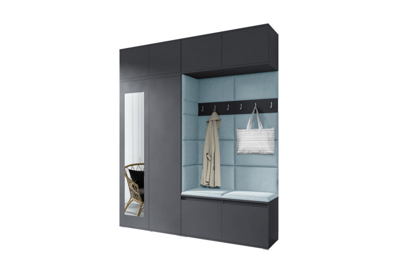 Predsieňová stena EUGENIO 16. Moderné prevedenie v atraktívnom dizajne. Vyrobená je z kvalitného lamina s ABS hranou. Tá chráni materiál pred mechanickým poškodením a vlhkosťou. Súčasťou predsieňovej steny sú čalúnené panely, ktoré sa lepia na stenu. Ďalej obsahuje skriňu s poličkou a tyčou na ramienka, vešiak, závesnú skrinku a botník s poličkou. Predsieňová stena stojí na nižších strieborných nožičkách, ktoré dodávajú stabilitu a pevnosť. Na výber máte z viacerých dekorov a viacerých druhov čalúnenia.