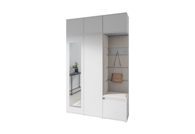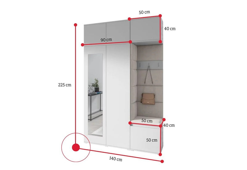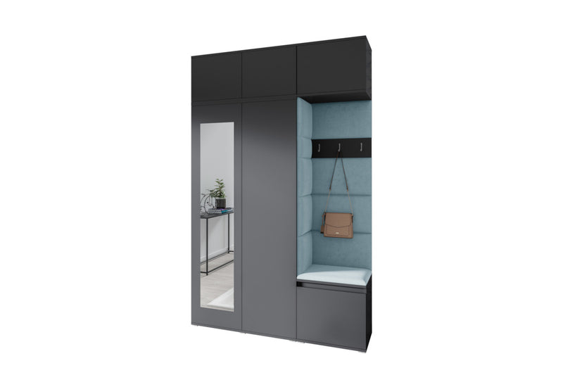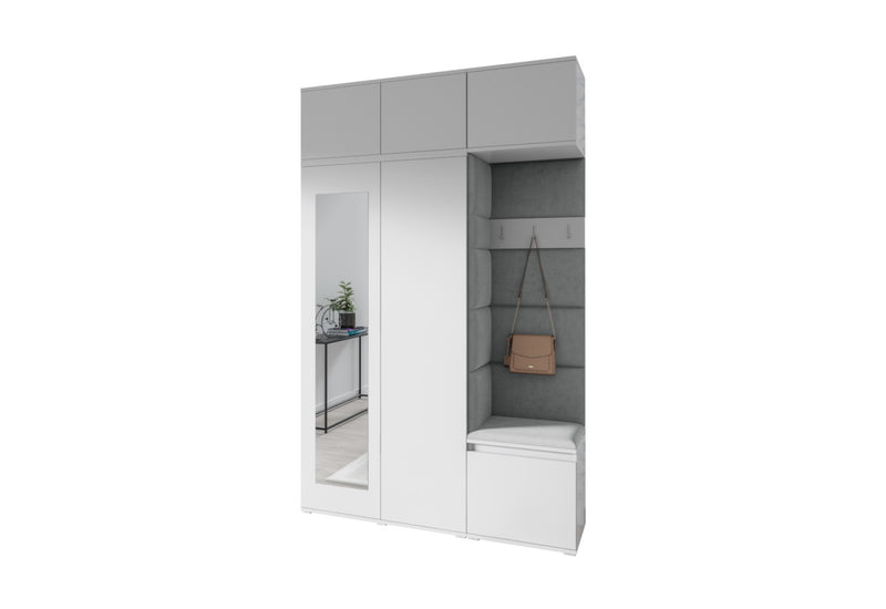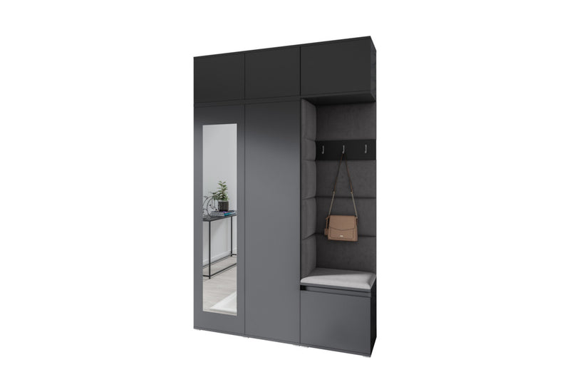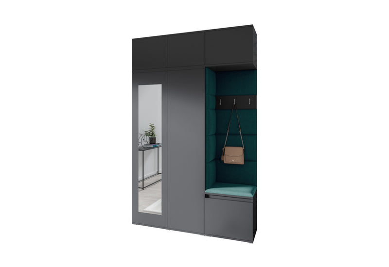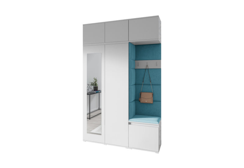 Predsieňová stena EUGENIO 18. Moderné prevedenie v atraktívnom dizajne. Vyrobená je z kvalitného lamina s ABS hranou. Tá chráni materiál pred mechanickým poškodením a vlhkosťou. Súčasťou predsieňovej steny sú čalúnené panely, ktoré sa lepia na stenu. Ďalej obsahuje skriňu s poličkou a tyčou na ramienka, vešiak, závesnú skrinku a botník s poličkou. Predsieňová stena stojí na nižších strieborných nožičkách, ktoré dodávajú stabilitu a pevnosť. Na výber máte z viacerých dekorov a viacerých druhov čalúnenia.