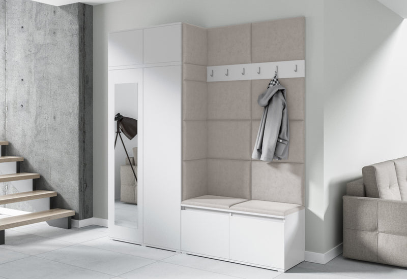 Predsiňová stena EUGENIO 19. Moderné prevedenie v atraktívnom dizajne. Vyrobená je z kvalitného lamina, ktoré je opatrené ABS hranou. Tá chráni materiál pred mechanickým poškodením a vlhkosťou. Súčasťou predsieňovej steny sú čalúnené panely, ktoré sa lepia na stenu, skriňa s poličkou a tyčou na ramienka, vešiak a botník s poličkou. Predsieňová stena stojí na nižších strieborných nožičkách, ktoré dodávajú stabilitu a pevnosť. Na výber máte z viacerých dekorov a viacerých druhov farieb čalúnenia.
