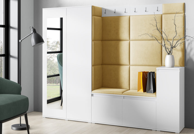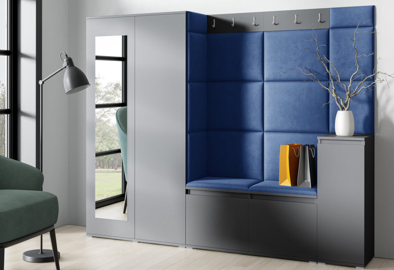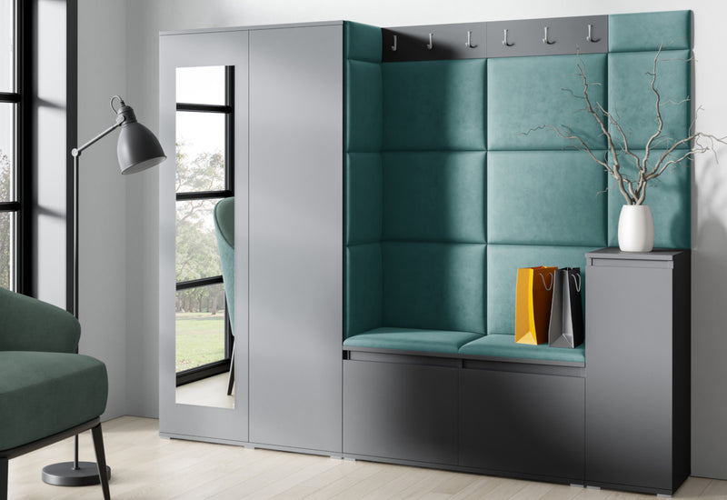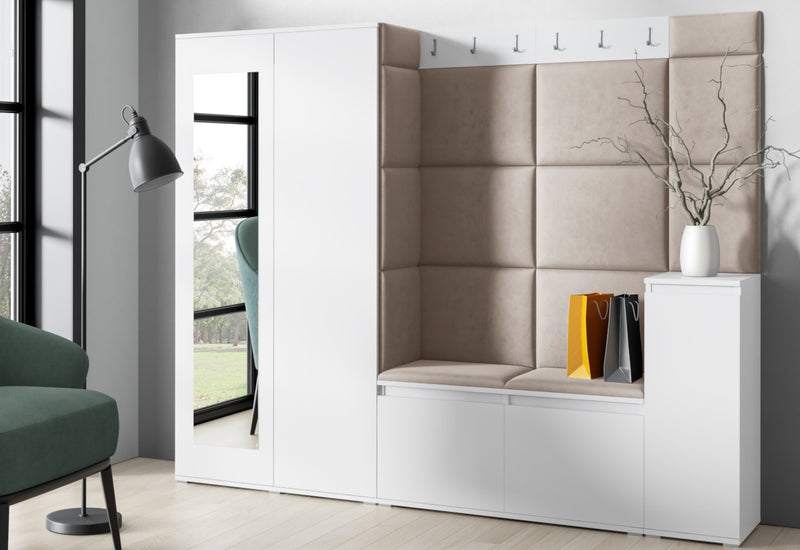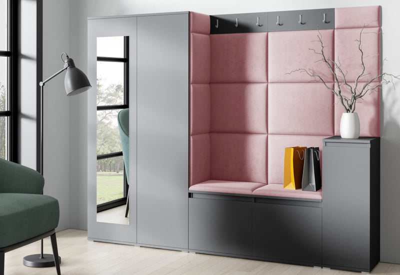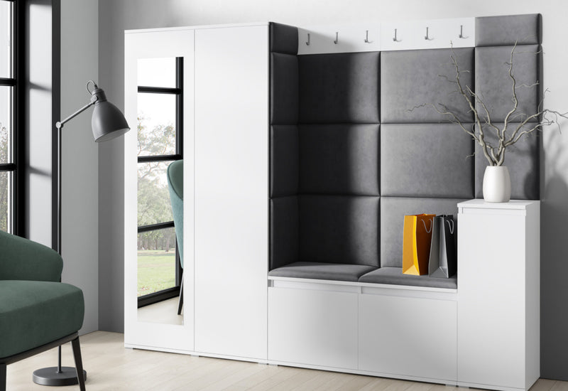 Predsieňová stena EUGENIO 27. Moderné prevedenie v atraktívnom dizajne. Vyrobená je z kvalitného materiálu s ABS hranou. Tá chráni materiál pred mechanickým poškodením a vlhkosťou. Súčasťou predsieňovej steny sú čalúnené panely, ktoré sa lepia na stenu. Ďalej obsahuje skriňu s poličkou a tyčou na ramienka, vešiak a botník s poličkou. Predsieňová stena stojí na nižších strieborných nožičkách, ktoré dodávajú stabilitu a pevnosť. Na výber máte z dvoch dekorov a viacerých druhov farieb čalúnenia.