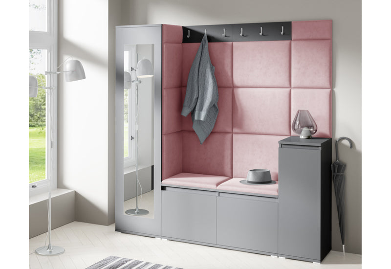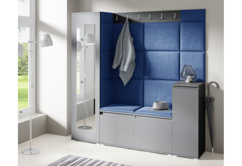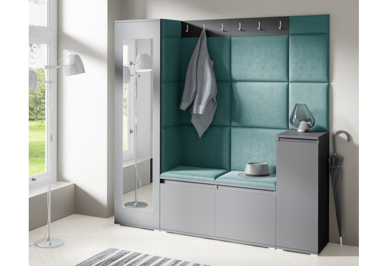 Predsieňová stena EUGENIO 28. Moderné prevedenie v atraktívnom dizajne. Vyrobená z kvalitného materiálu s ABS hranou. Tá chráni materiál pred mechanickým poškodením a vlhkosťou. Súčasťou predsieňovej steny sú čalúnené panely, ktoré sa lepia na stenu. Ďalej obsahuje skriňu s poličkou a tyčou na ramienka, vešiak a botník s poličkou. Predsieňová stena stojí na nižších strieborných nožičkách, ktoré dodávajú stabilitu a pevnosť. Na výber máte z dvoch dekorov a viacerých farieb čalúnenia.