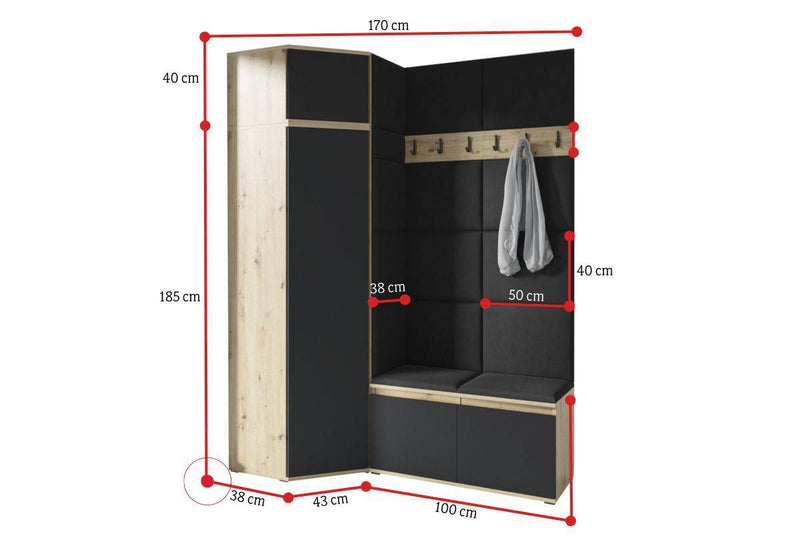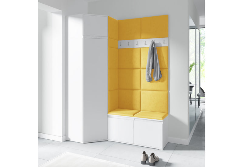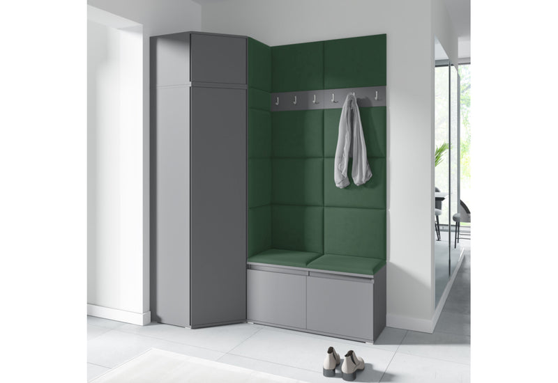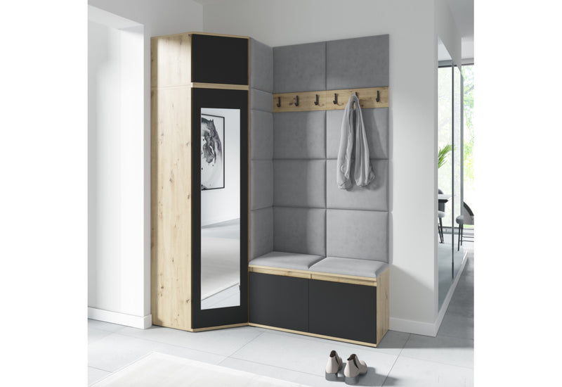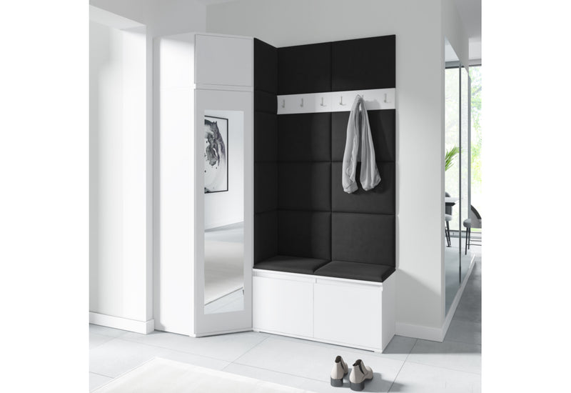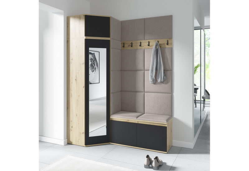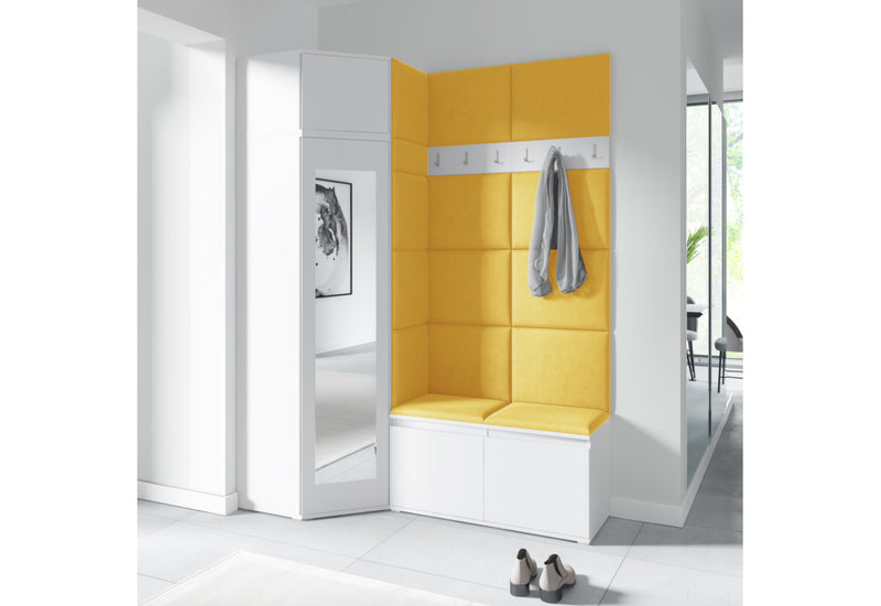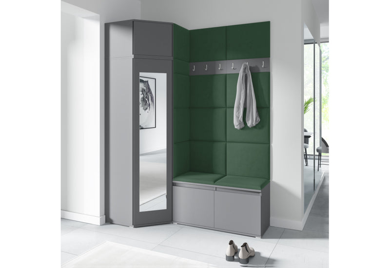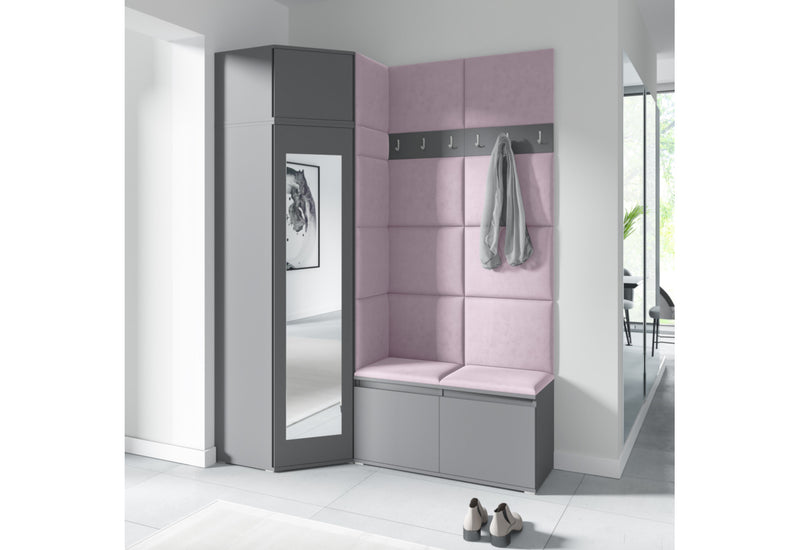 Predsieňová zostava EUGENIO 37. Moderné prevedenie v atraktívnom dizajne. Vyrobená je z kvalitného materiálu. Súčasťou predsieňovej steny sú čalúnené panely, ktoré sa lepia na stenu, skriňa s poličkou a tyčou na ramienka, vešiak a botník. Predsieňová stena stojí na nižších strieborných nožičkách, ktoré dodávajú stabilitu a pevnosť. Na výber máte z viacerých dekorov a viacerých druhov farieb čalúnenie. Možnosť voľby zrkadla.