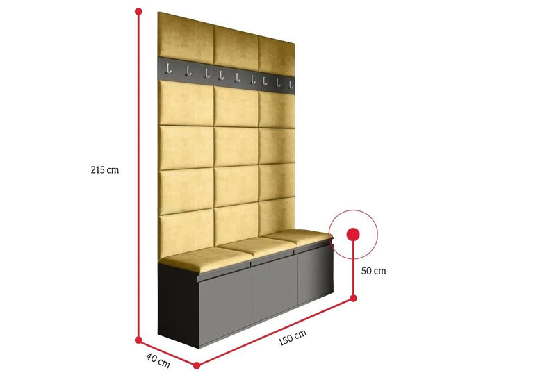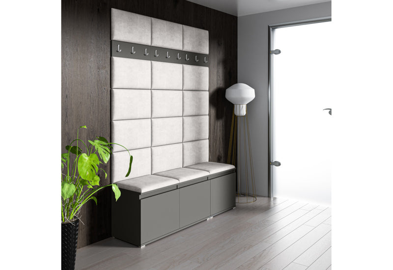 Predsieňová zostava EUGENIO 6. Moderné prevedenie v atraktívnom dizajne. Vyrobená je z kvalitného lamina s ABS hranou. ABS hrana chráni materiál pred mechanickým poškodením a vlhkosťou. Súčasťou predsieňovej steny sú čalúnené panely, ktoré sa lepia na stenu. Ďalej obsahuje botník a vešiak. Predsieňová zostava stojí na nižších strieborných nožičkách, ktoré dodávajú stabilitu a pevnosť. Možnosť výberu z viacerých dekorov a čalúnenia.