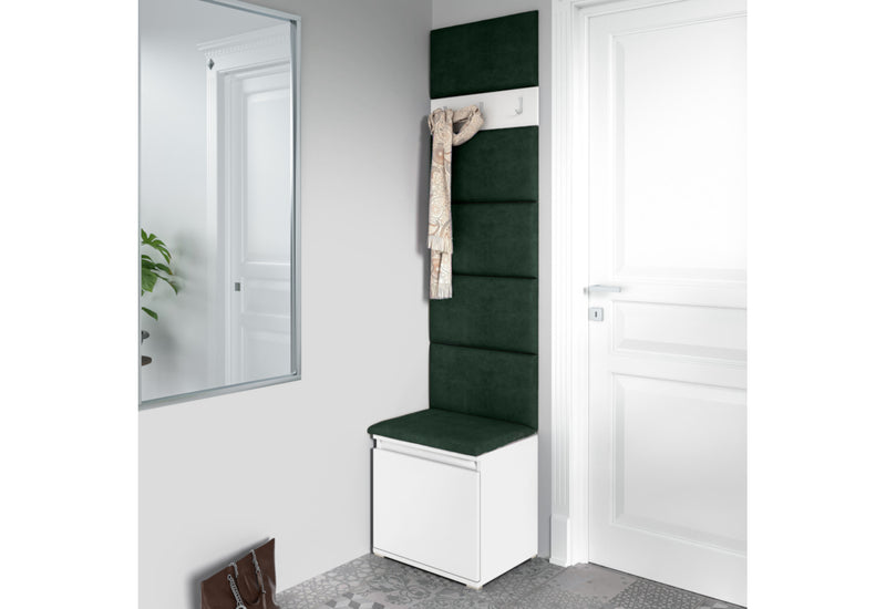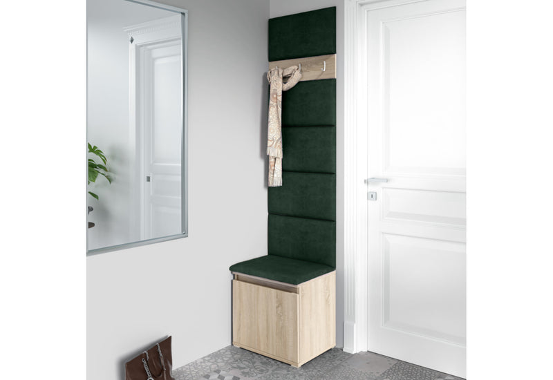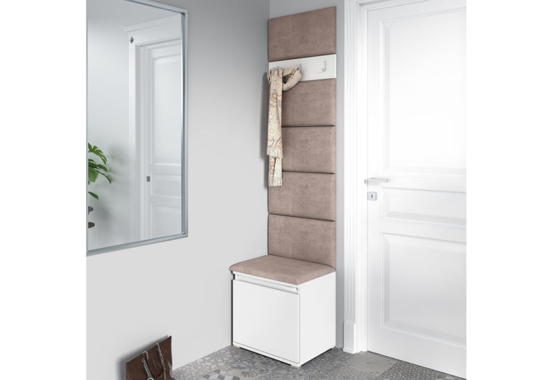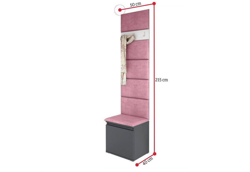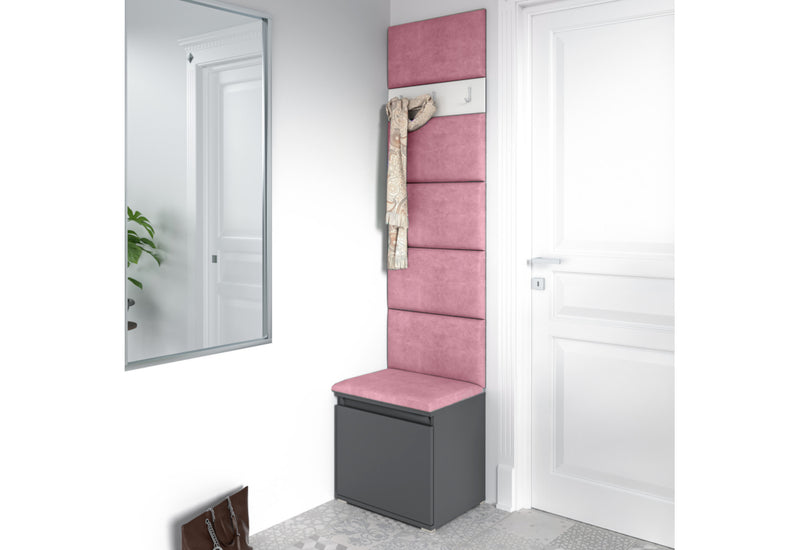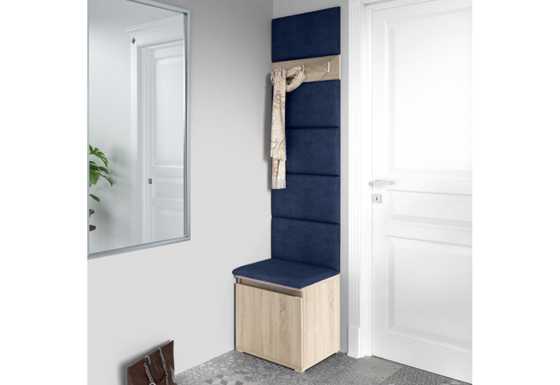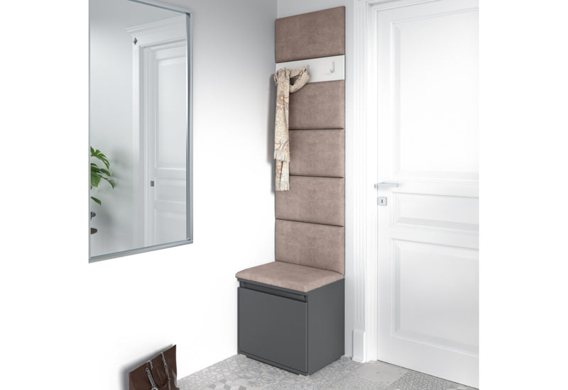 Predsieňová zostava EUGENIO 7. Moderné prevedenie v atraktívnom dizajne. Vyrobená je z kvalitného materiálu, ktoré je opatrené ABS hranou. Tá chráni materiál pred mechanickým poškodením a vlhkosťou. Súčasťou predsieňovej steny je čalúnený panel, ktorý sa lepí na stenu, skrinka s dvierkami a vešiak. Predsieňová zostava stojí na nižších nožičkách, ktoré dodávajú stabilitu a pevnosť. Na výber máte z viacerých dekorov a viacerých druhov farieb čalúnenia.