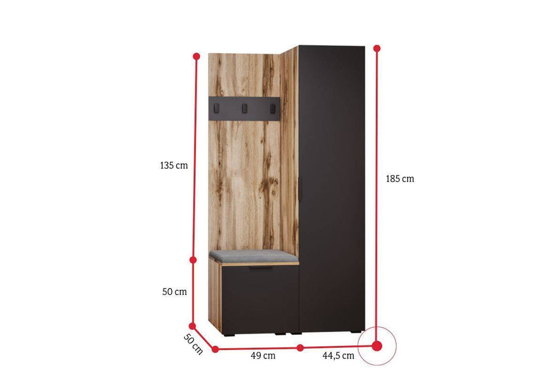 Predsieňová zostava LOMIR 2.Vyrobená je z kvalitného materiálu, opatrená je ABS hranami, ktoré ju chránia pred možným poškodením. Súčasťou zostavy je skrinka na topánky s čalúneným sedákom, sklopnými dvierkami a poličkou, skriňa so šatníkovou tyčou a poličkou. V hornej časti sú tri vešiaky. Dvierka sú opatrené úchytmi. Orientáciu si zvolíte pri montáži. Možnosť voľby zrkadla.