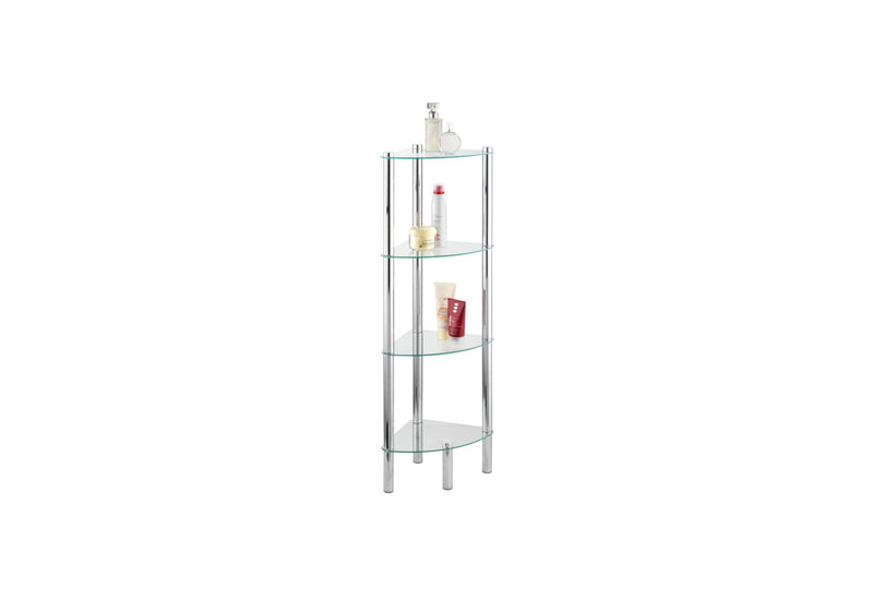 Regál DIDIER 2. Praktické využitie v modernom štýle. Vyrobený je z kovu v striebornom dekore. Poskytne dostatok priestoru na odkladanie vecí. Regál tvoria celkom štyri otvorené police z priehľadného tvrdeného bezpečnostného skla so štýlovým rohovým dizajnom. Regál stojí na vyšších pevných nohách pre väčšiu stabilitu. Vhodný do kúpeľní alebo obývacích izieb.