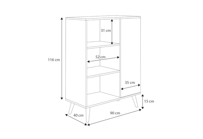 Regál FENCY. Zaujme svojím zpracovaním v škandinávskom štýle. Vyrobený je z kvalitného materiálu s hrúbkou 1,8 cm, ktorý je chránený ABS hranami proti možnému poškodeniu. Ponúka veľké množstvo úložného priestoru. Vybavený je otvorenými policami a skrinkou s dvierkami, ktorá je vo vnútri rozdelená policami. Regál má univerzálne nastavenie, pri montáži je možné zvoliť stranu na umiestnenie skrinky. Možnosť výberu z viacerých dekorov.