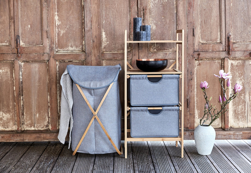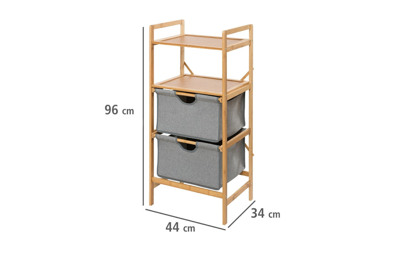 Regál MARTINE 2. Rovné línie a elegantný vzhľad v škandinávskom štýle. Vyrobený je v kombinácii bambusového dreva a látky z polyesteru. Zachovaná je štruktúra dreva. Základ tvorí pevná konštrukcia v hnedej farbe. Jednoduchý dizajn a praktické využitie. Súčasťou regálu sú dve otvorené police a úložný priestor v podobe dvoch košov. Vhodný do kúpeľne alebo spálne.