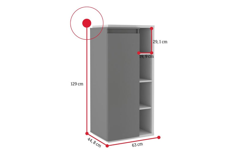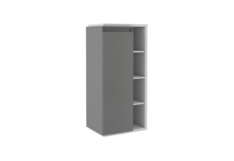 Regál MONA. Moderný štýlový regál je vyrobený z kvalitného materiálu s hrúbkou 1,6 a 2,8 cm s ABS hranami. Chraní tak materiál pred mechanickým poškodením a vlhkosťou. Regál poskytuje dostatok úložného priestoru v podobe skrinky a otvorených políc po stranách regálu. Vnútri je skrinka rozdelená dvoma policami. K dispozícii sú aj ďalšie produkty z rovnakého radu MONA.