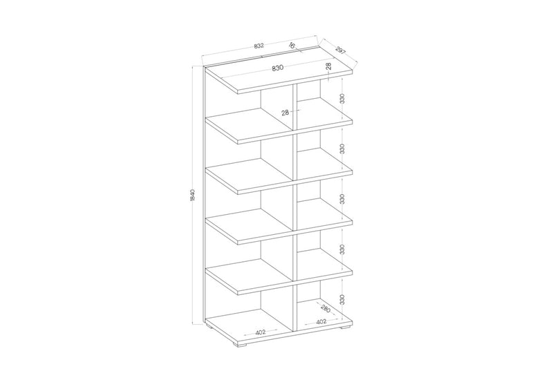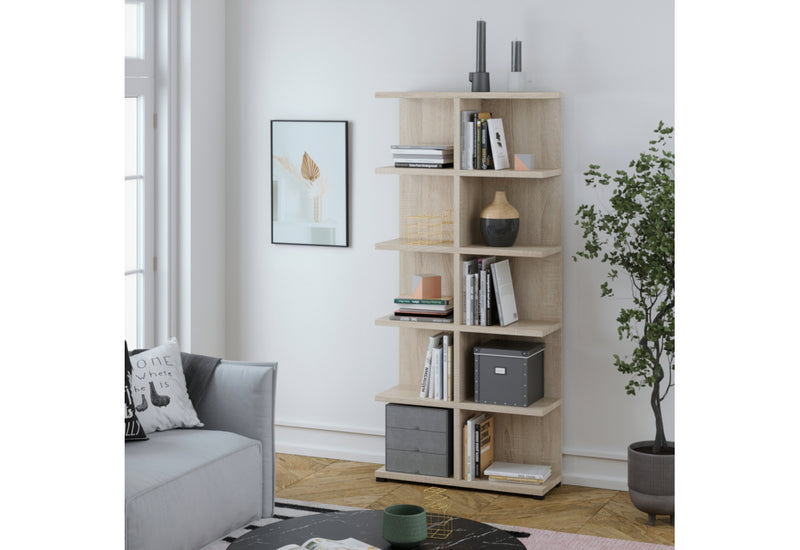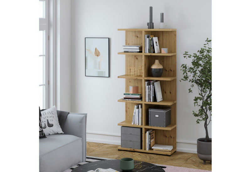 Regál MORIKO. Praktický a priestranný vysoký regál v modernom vzhľade. Je vyrobený z kvalitného materiálu o sile 2,8 cm, proti poškodeniu ho chráni hrana ABS. Regál tvorí celkom päť radov otvorených políc, s dostatočným odkladacím priestorom. Regál môžete umiestniť do priestoru aj do rohu miestnosti. Možnosť výberu z viacerých dekorov.
