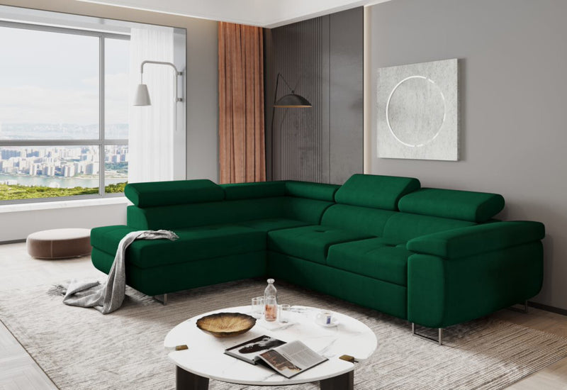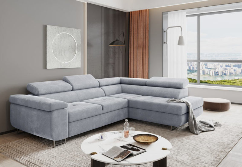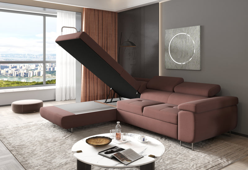 Rohová rozkladacia sedačka ALFA 2. Moderná nadčasová sedačka. Disponuje rozkladacím mechanizmom, ktorý ju ľahko premení na lôžko. Ďalšou výhodou je úložný priestor, ktorý nájdete v ramene a nastaviteľné opierky hlavy. Jadrom sedačky je drevená MDF konštrukcia s výplňou z pružiny Falliste a PUR peny. Stojí na vyšších nožičkách pre väčšiu stabilitu a vzdušnosť. Vybrať si môžete nielen orientáciu rohu ale aj farbu.