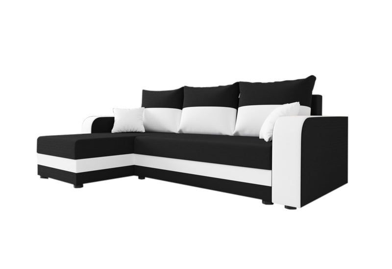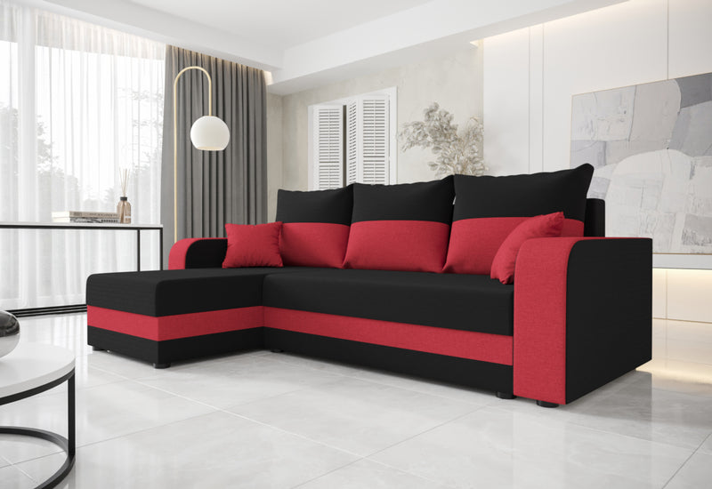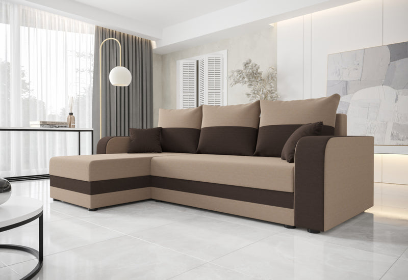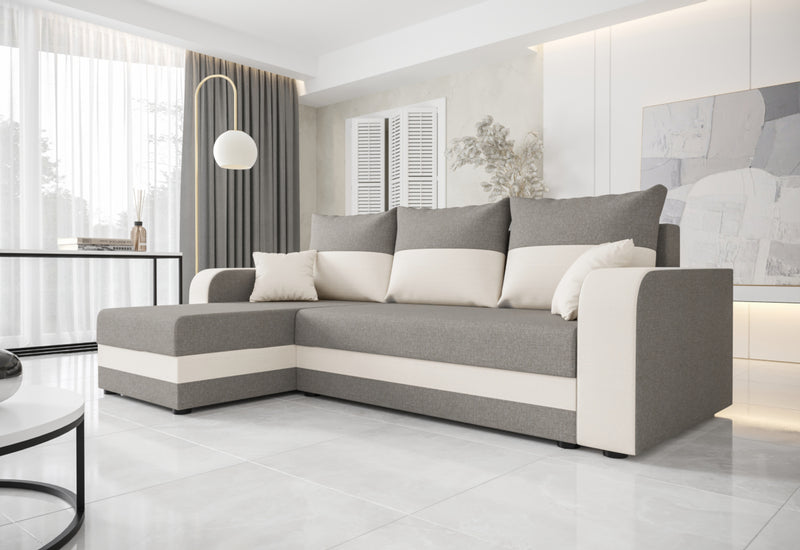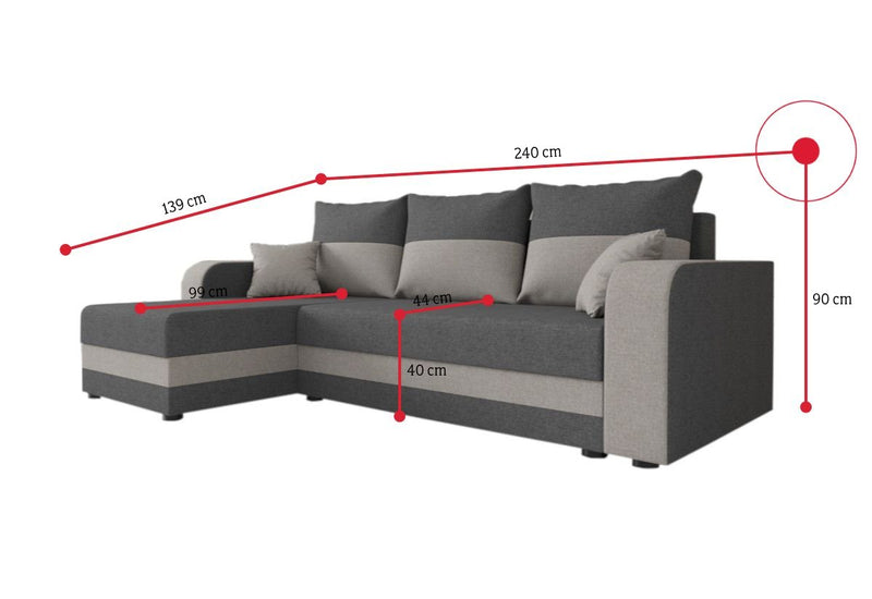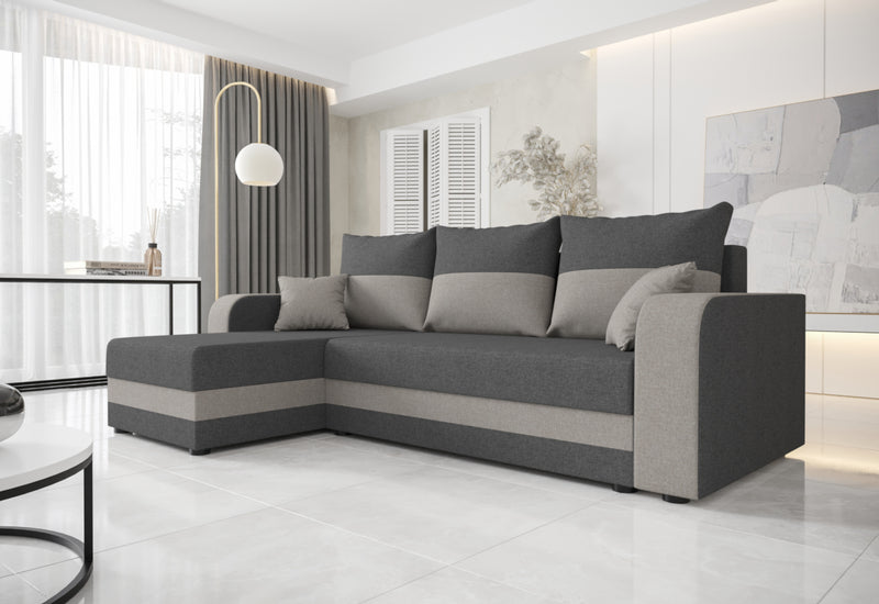 Rohová rozkladacia sedačka MARIKA. Disponuje mnohými benefitmy, medzi ktoré určite patrí aj rozkladací mechanizmus. Behom chvíle tak vykúzlite priestranné lôžko. Ďalšou výhodou je úložný priestor. Tri veľké vankúše dostanete k sedačke ZADARMO. Celý povrch vrátane zadnej časti je potiahnutý látkou. Konštrukciu tvorí pevný rám a orientácia rohu je univerzálna. To znamená, že si ju určíte až pri zostavovaní v pohodlí domova.