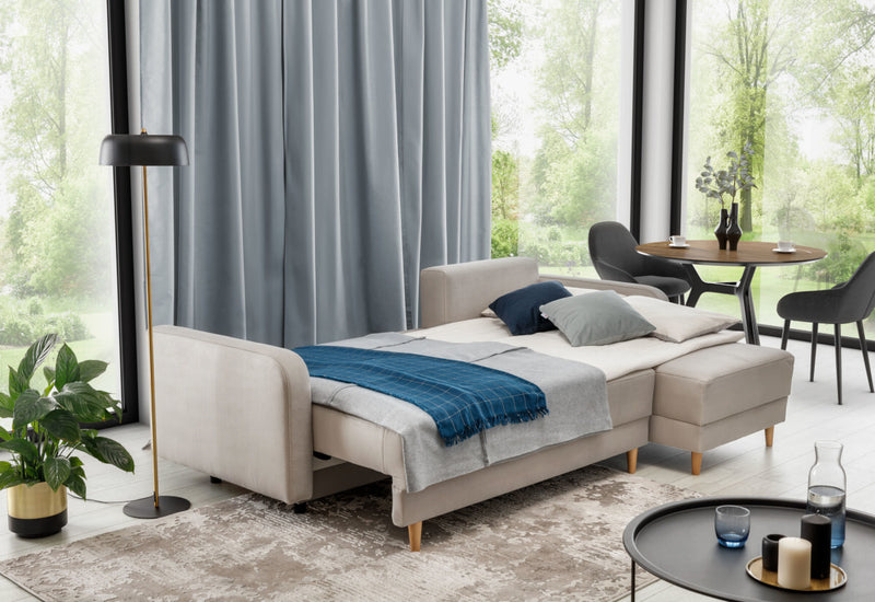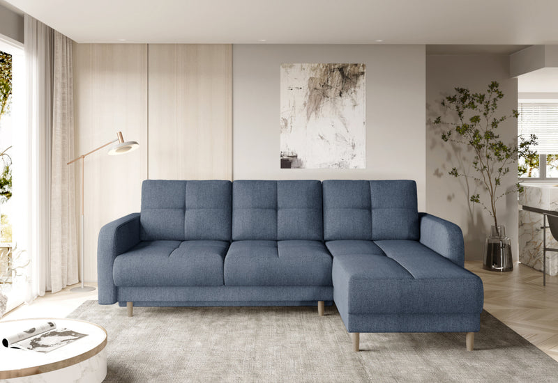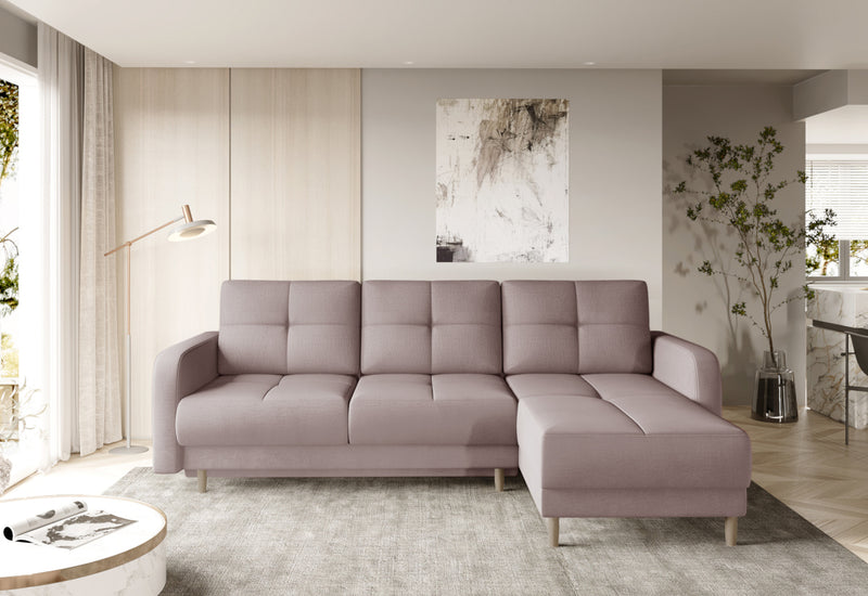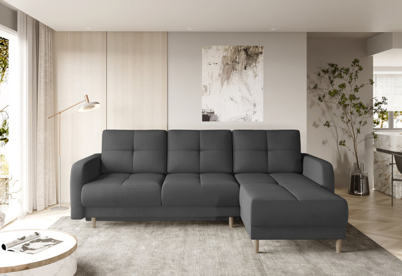 Rohová sedacia súprava PROXI. Sedacia súprava Vás na prvý pohľad zaujme svojim jednoduchým dizajnom a výrazným prešívaním. Súčasťou sedačky je úložný priestor a rozkladací mechanizmus, vďaka ktorému ľahko premeníte sedačku na lôžko pre príležitostné prespanie. Kvalitné polstrovanie s výplňou z HR peny ponúka pohodlie pri odpočinku a relaxácii. Celú konštrukciu podopierajú nízke nožičky z masívu, ktoré zaistia pevnosť a stabilitu. Možnosť voľby z viacerých čalúnení.