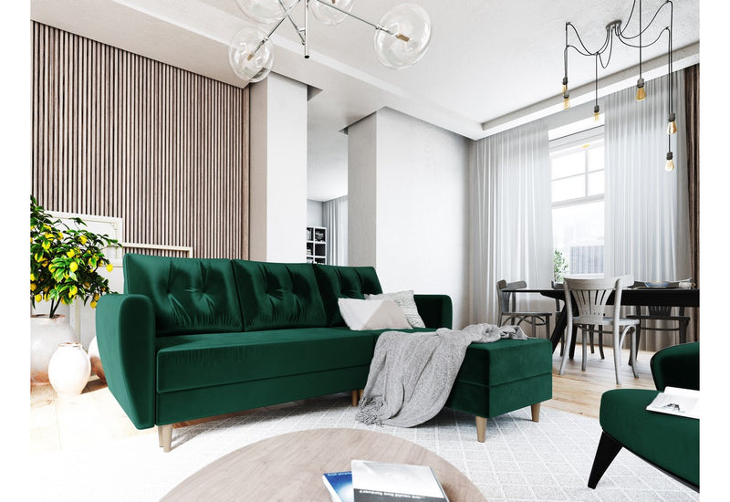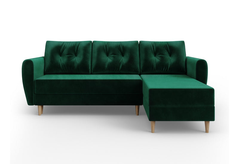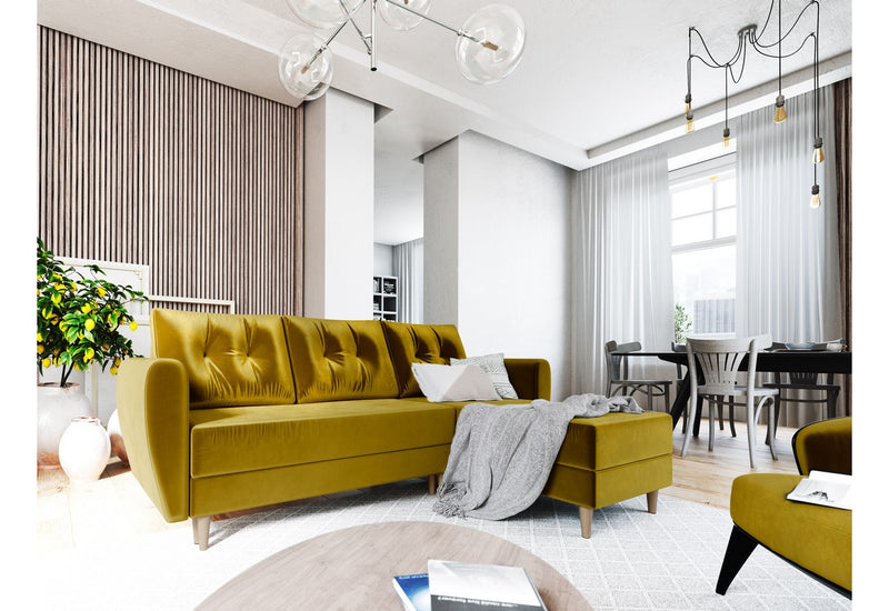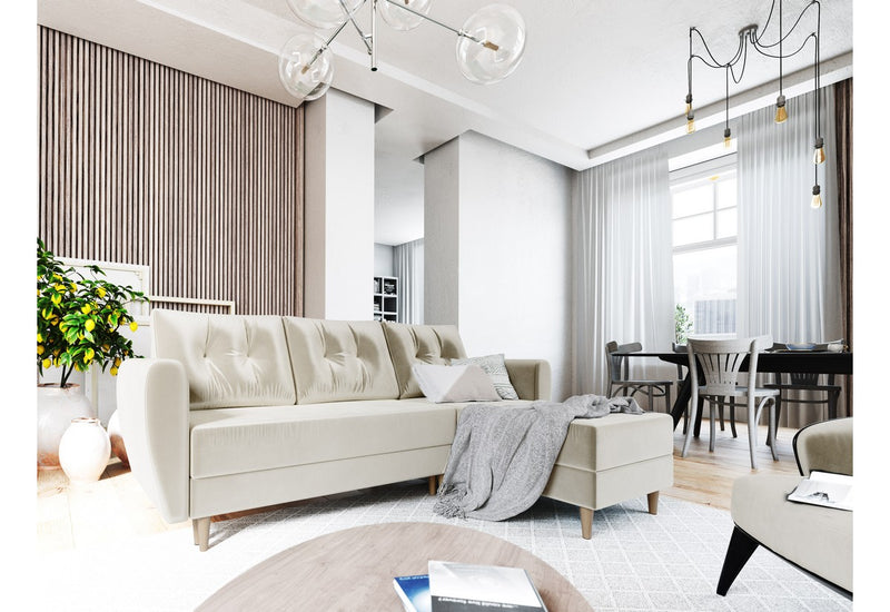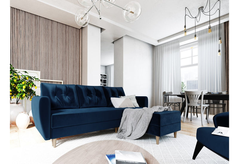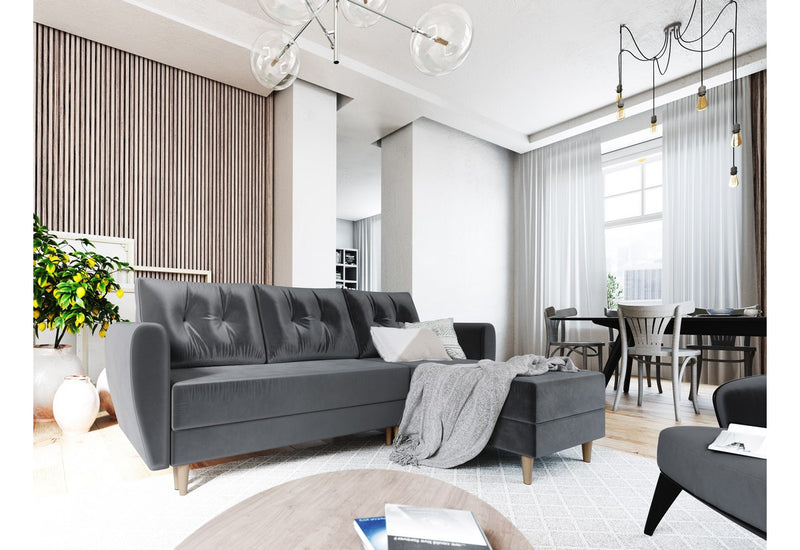 Rohová sedacia súprava SUN vás zaujme na prvý pohľad originálne prešívanými vankúšmi. Vďaka rozkladaciemu mechanizmu ľahko premeníte sedačku na posteľ. Sedacia časť je vyplnená PUR penou T30 a pružinami faliste. Potiahnutá je na dotyk príjemnou látkou. Pevnosť a stabilitu zaručuje kvalitne vyrobený rám. Súčasťou sedačky je úložný priestor. Vyberať si môžete z viacerých farieb.