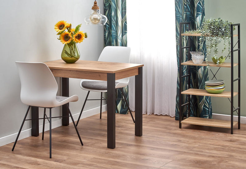 Rozkladací jedálenský stôl ELINA. Zaujme jednoduchými líniami industriálneho štýlu a stane sa tak obľúbeným prvkom vášho interiéru. Stôl je v dekore dub wotan, ktorý je veľmi obľúbený a tiež je doplnený o čierne silnejšie nohy. Nohy zaistia pevnosť a stabilitu. Dosku stola jednoducho rozložíte na šírku 138 cm pomocou prídavnej dosky. Vďaka tomu vytvoríte dostatok priestoru pre vašu rodinu. Stôl je vyrobený z kvalitnej dyhy.