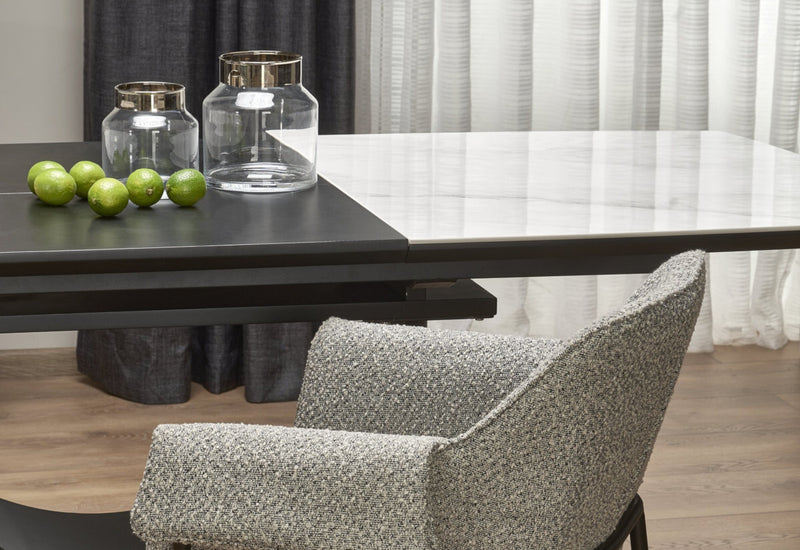 Rozkladací jedálenský stôl VIRUL. Netradičný moderný vzhľad. Vyrobený je z kvalitných materiálov. Dominantným prvkom je originálne riešený elegantný podstavec stola, ktorý zároveň zaisťuje požadovavú stabilitu a pevnosť. Doska stola v mramorovom dekore ponúka priestrannú jedálenskú plochu, ktorú je možné rozložiť až na šírku 220 cm pomocou rozkladacieho mechanizmu. Vďaka svojmu vzhľadu sa ľahko stane dominantou každej kuchyne či jedálne.