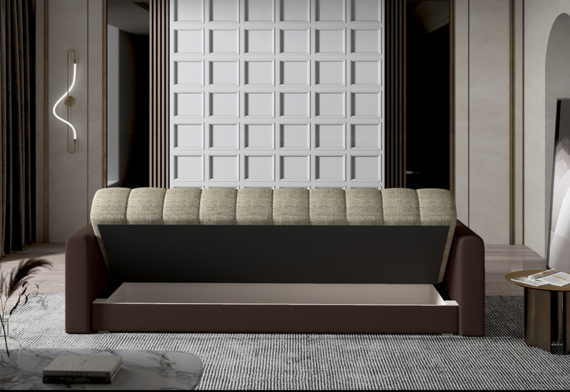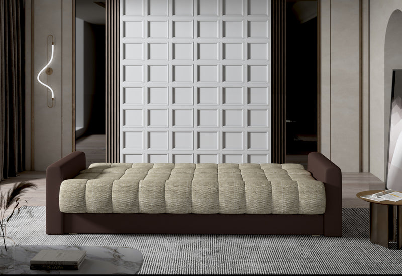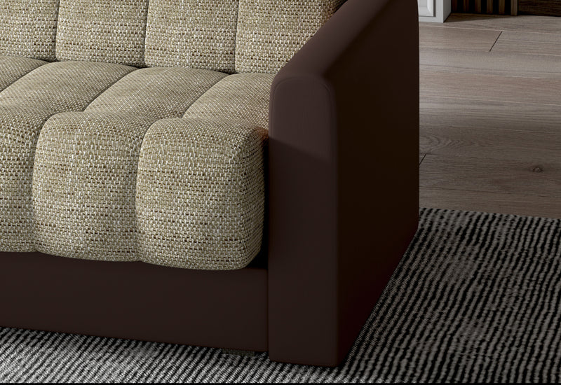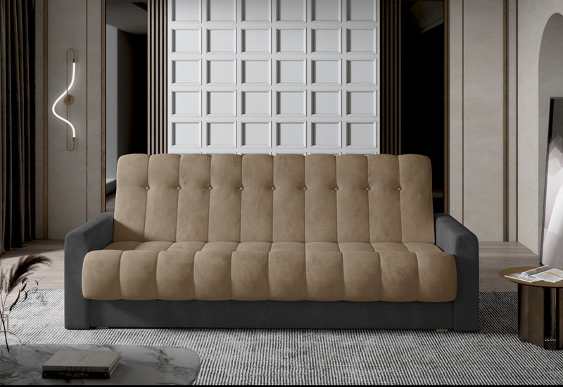 Rozkladacia čalúnená pohovka GARNET. Jednoduché rovné línie v rustikálnom štýle. Pohovka disponuje vyšším operadlom chrbta a prešívaným čalúnením. Výplň je tvorená penou T25 v kombinácii s bonellovými pružinami. Vďaka rozkladaciemu mechanizmu ľahko premeníte pohovku na lôžko. Súčasťou je úložný priestor. Konštrukciu podopierajú nižšie nožičky. Vybrať si môžete z viacerých farebných kombinácií.