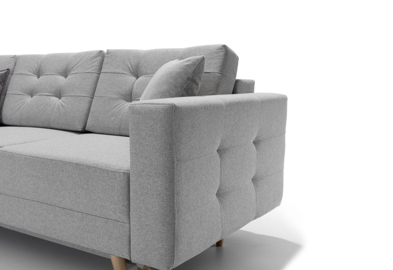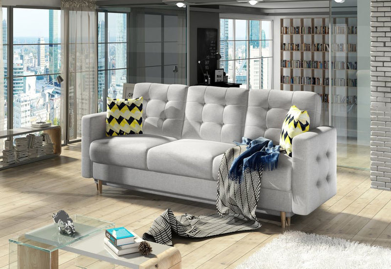 Rozkladacia pohovka ASTRA. Elegantné prešívanie bočnej časti, ktoré je doplnené o dekoračné vankúšiky dodávajú pohovke moderný a nadčasový vzhľad. Jednoduchým krokom možno vytvoriť lôžko pre príležitostné spanie. Výplň sedacej plochy tvoria pružiny faliste. Istota komfortu pri odpočinku. Drevené nožičky zaistia stabilitu a pevnosť. Výhodou je veľký výber farebných kombinácií.