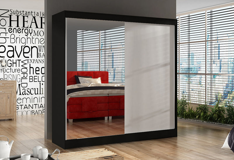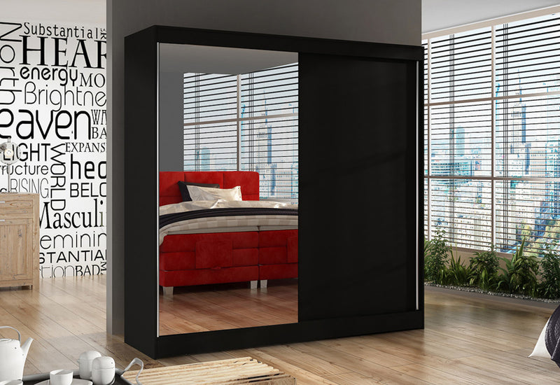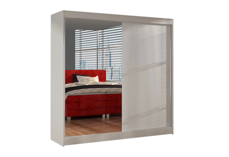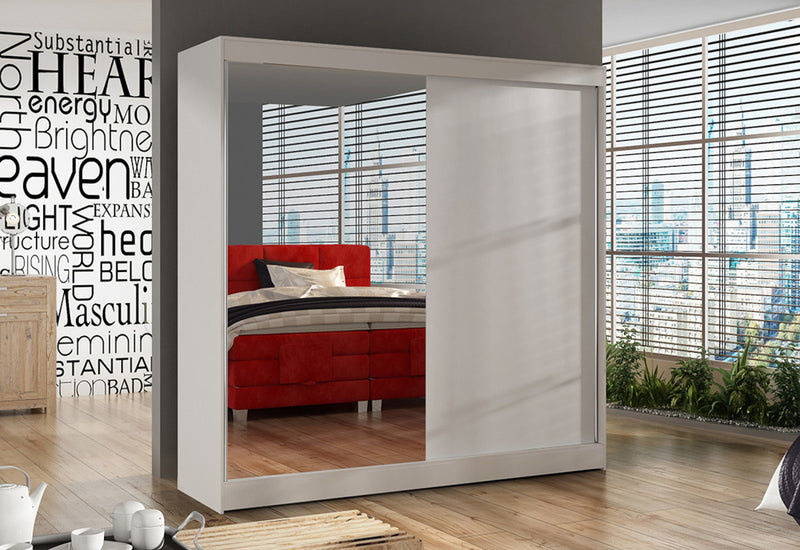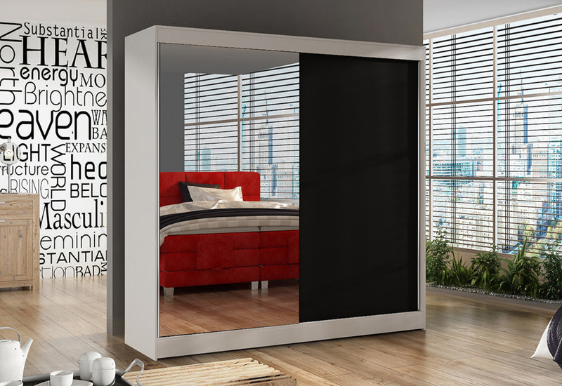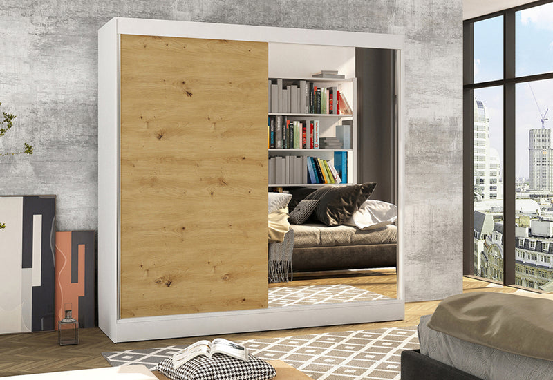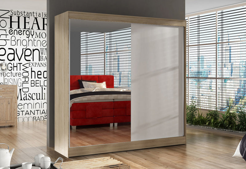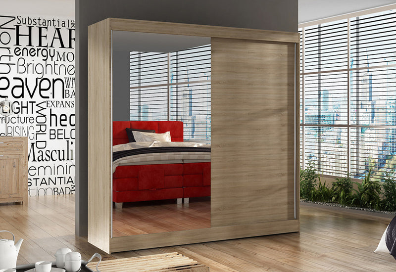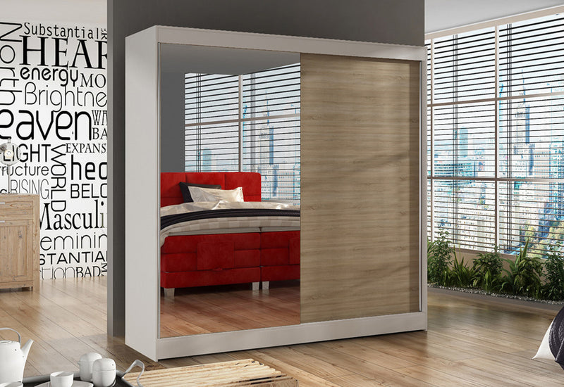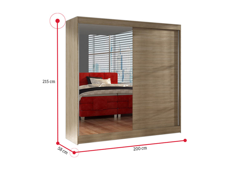 Šatníková skriňa AKIS I. Zaujme vás jednoduchými líniami moderného šatníka. Je vyrobená z vysokokvalitného materiálu so šírkou 1,6 cm. Za posuvnými dverami sa nachádza veľký úložný priestor. Poskytne vám priestranné police a šatníkovú tyč. Na jednoduchšie otváranie sú dvere vybavené dlhou rukoväťou. Súčasťou je veľké zrkadlo. Na výber je niekoľko dekorov.