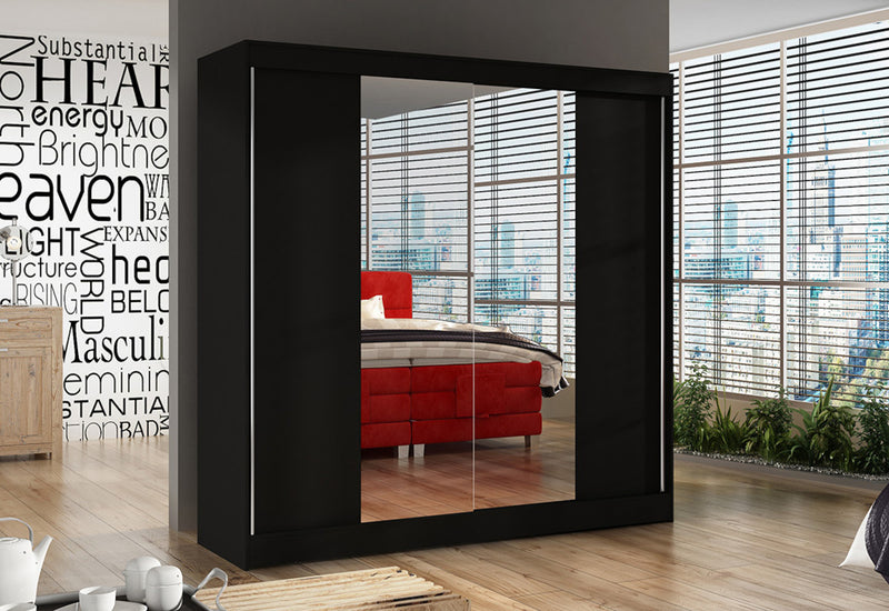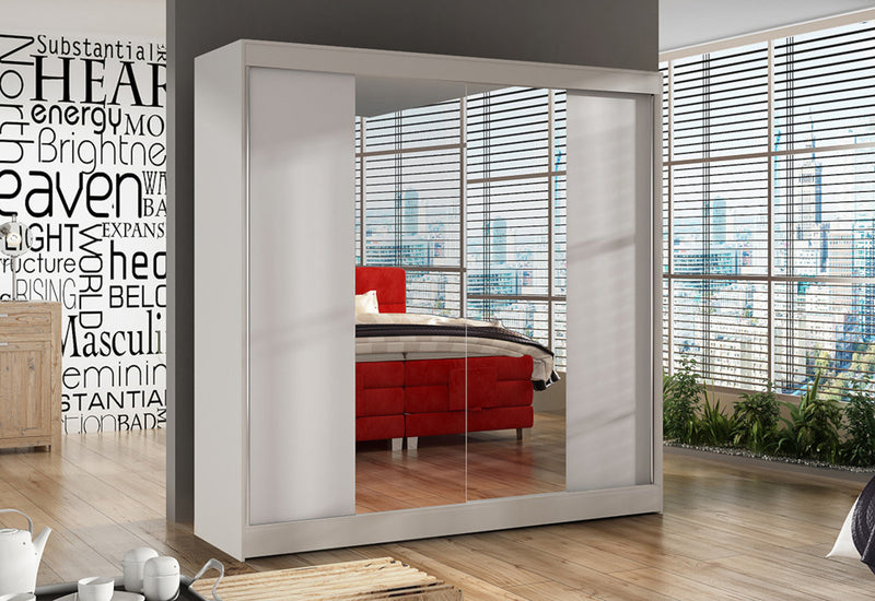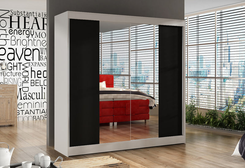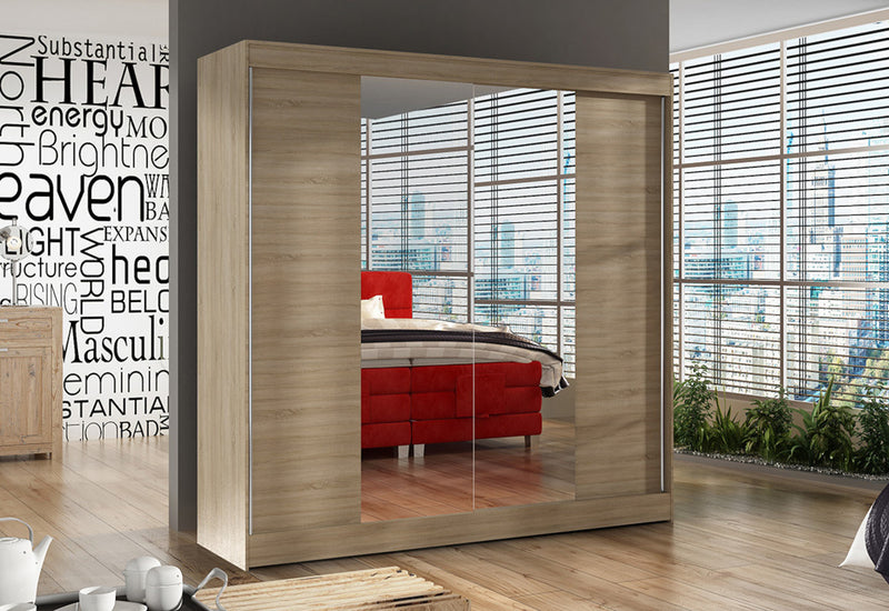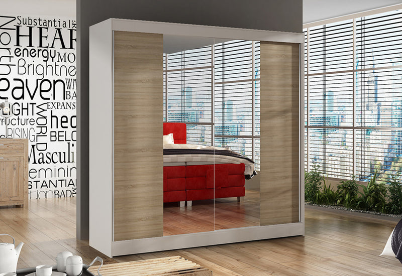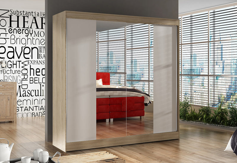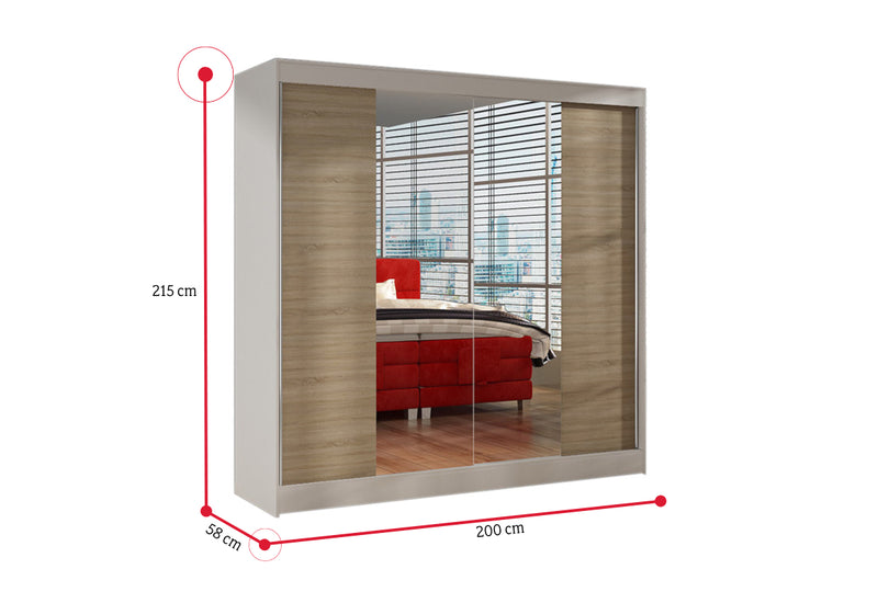 Šatníková skriňa AKIS II. Zaujme vás jednoduchými líniami moderného šatníka. Je vyrobená z vysokokvalitného materiálu so šírkou 1,6 cm. Za posuvnými dverami sa nachádza veľký úložný priestor. Poskytne vám priestranné police a šatníkovú tyč. Na jednoduchšie otváranie sú dvere vybavené dlhou rukoväťou. Súčasťou balenia je veľké zrkadlo. Na výber je niekoľko dekorov.