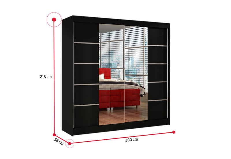 Šatníková skriňa AKIS V. Zaujme vás jednoduchými líniami moderného šatníka. Je vyrobená z kvalitného materiálu s hrúbkou 1,6 cm s hranami ABS. Za posuvnými dverami sa nachádza veľký úložný priestor. Poskytne vám priestranné police a šatníkovú tyč. Na jednoduchšie otváranie sú dvere vybavené dlhou rukoväťou. Súčasťou je veľké zrkadlo. Na výber je niekoľko dekorov.