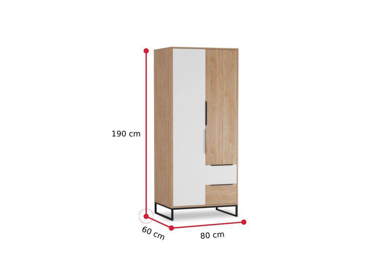 Šatníková skriňa ANDRO. Je vyrobená z kvalitného materiálu o sile 1,6 cm. Poskytuje dostatok úložného priestoru v podobe troch poličiek, dvoch šuplíkov a skriniek. Dve šatníkové tyče zaistia komfort pri uskladnení vášho oblečenia. Vďaka ABS hrane je chránená pred mechanickým poškodením a vlhkosťou. Skriňa stojí na vyšších kovových nožičkách. Je možné kombinovať s ďalšími produktmi z radu ANDRO.