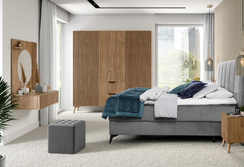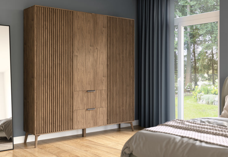 Šatníková skriňa ETSIAN. Je vyrobená z kvalitného materiálu s hrúbkou 1,6 cm. Pevná konštrukcia z kvalitnej dosky zaistí stabilitu a odolnosť proti poškodeniu. Skriňa poskytuje dostatok úložného priestoru v podobe dvoch zásuviek a dvoch šatníkových tyčí, na ktoré môžete zavesiť svoje oblečenie. Šuplíky sú opatrené ABS hranami, ktorý ich chráni pred poškodením. Uprostred skrine sa nachádzajú priestranné police. Zásuvky majú úzke čierne úchytky. Čelá bočných dvierok sú zdobené frézovanými detailmi. Skriňa stojí na vyšších nožičkách.