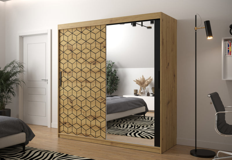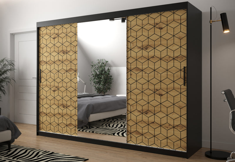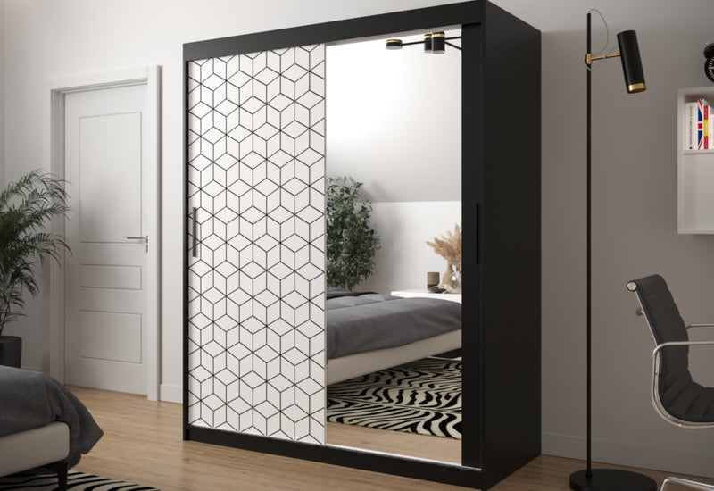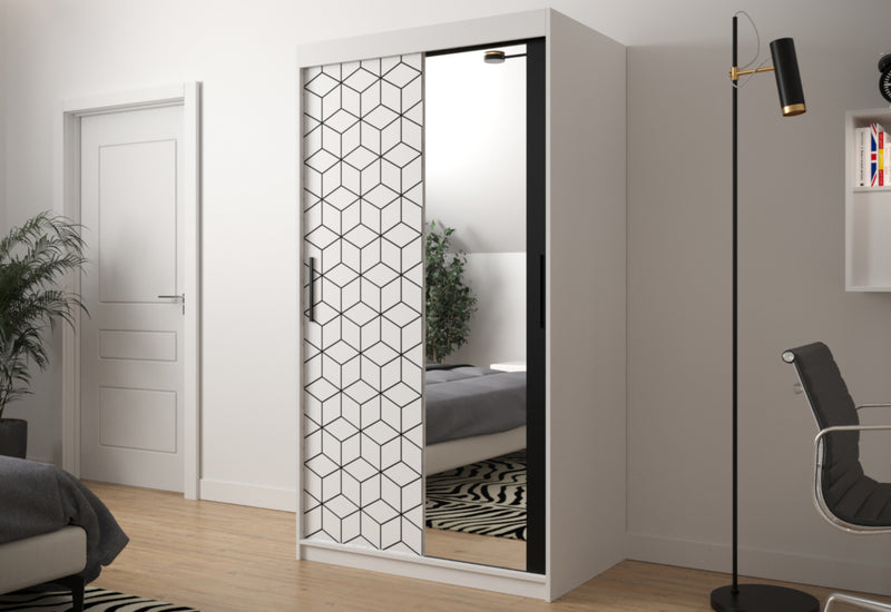 Šatníková skriňa FLASTER 2. Elegantná šatníková skriňa poskytuje dostatok úložného priestoru v podobe šatníkových tyčí a niekoľkých políc. Skriňa je vyrobená z vysokokvalitného materiálu s hrúbkou 1,6 cm. Posuvné dvere skrine sú vybavené koľajničkami, ktoré uľahčujú otváranie dverí. Rukoväte v čiernej farbe sú veľmi elegantné. Dvierka skrinky sú doplnené zrkadlom a počet políc sa líši podľa šírky skrinky.