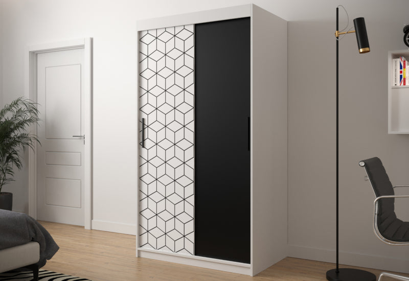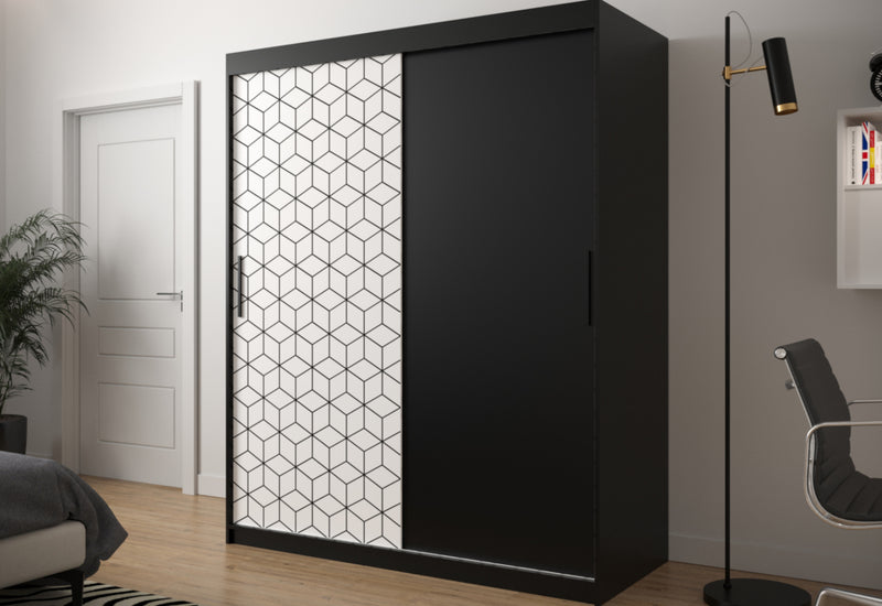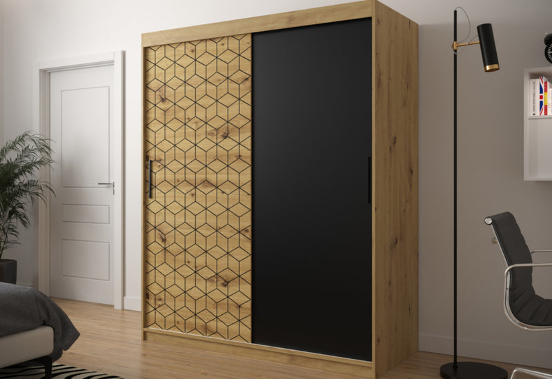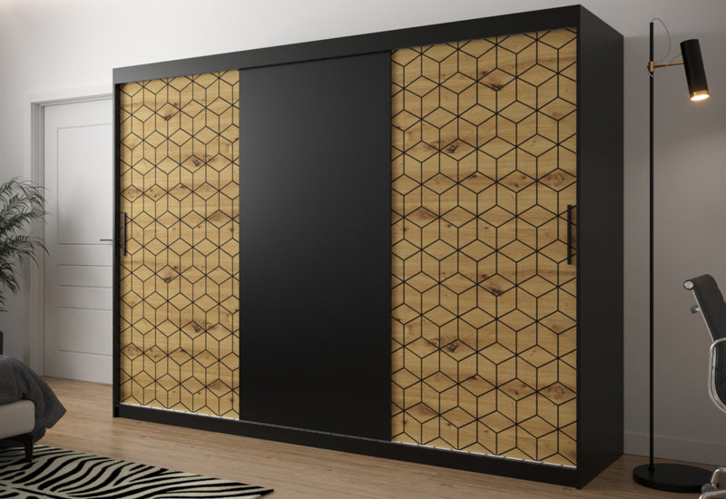Šatníková skriňa FLASTER 3. Elegantná skriňa poskytuje dostatok úložného priestoru v podobe tyčí a políc. Skriňa je vyrobená z vysokokvalitného materiálu 1,6 cm. Posuvné dvere skrine majú koľajničky, ktoré uľahčujú otváranie dverí. Úchyty sú v čiernej elegantnej farbe. Počet políc vždy závisí od rozmeru skrine.