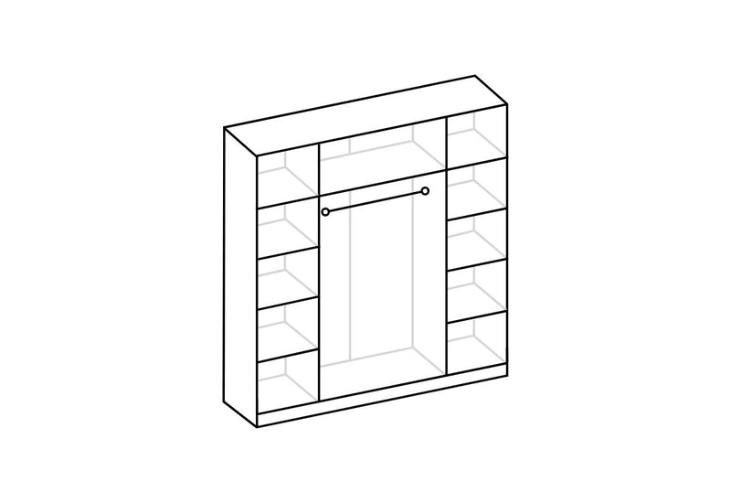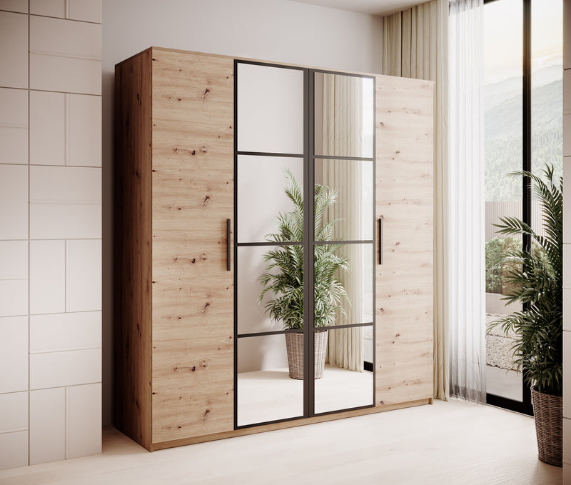 Šatníková skriňa MAKLEN. Zaujme Vás moderným vzhľadom. Vyrobená je z kvalitného materiálu s hrúbkou 1,6 cm. Vnútorné usporiadanie štvordverovej šatníkovej skrine ponúka úložný priestor v podobe políc a šatníkovej tyče. Súčasťou dvoch dverí sú zrkadlá. Vonkajšie dvere sú opatrené úzkymi úchytmi. Možno kombinovať s ďalšími produktmi z radu MAKLEN.