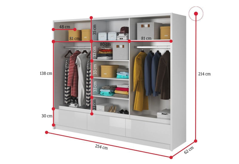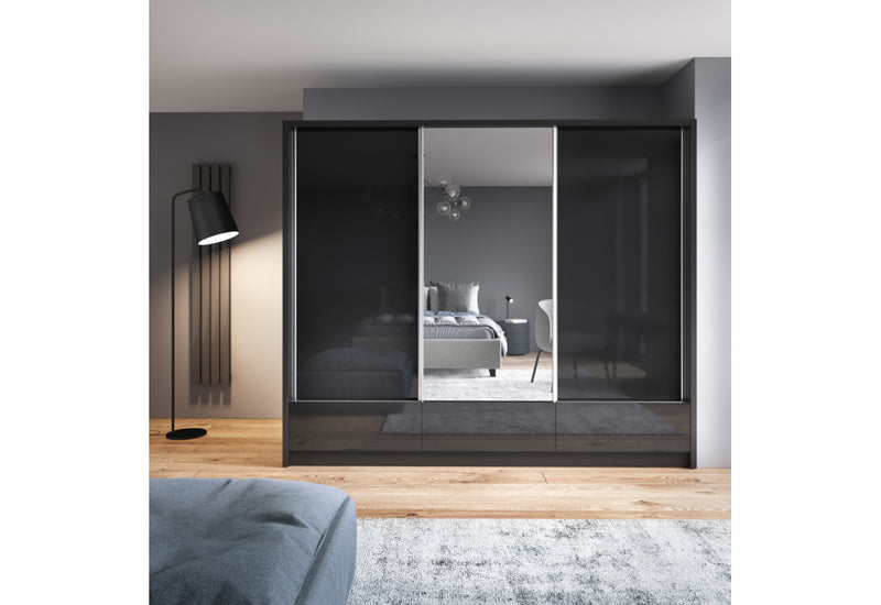Posuvná skriňa so zrkadlom MARINEL 2. Zaujme jednoduchým spracovaním v modernom štýle. Konštrukcia je vyrobená z kvalitného materiálu s hrúbkou 1,6 cm. Vybavená je ABS hranami, ktoré chránia materiál pred mechanickým poškodením a vlhkosťou. Šatníková skriňa poskytuje dostatok úložného priestoru v podobe zásuviek, políc a šatníkovej tyče. Jedny dvere skrine sú doplnené o zrkadlo. Pre ľahšie otvorenie sú dvere vybavené dlhou rukoväťou.