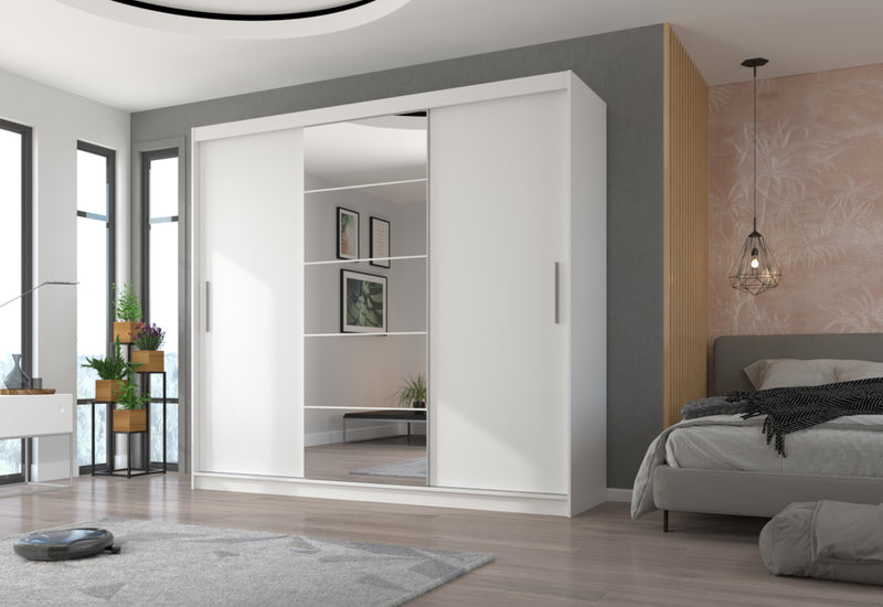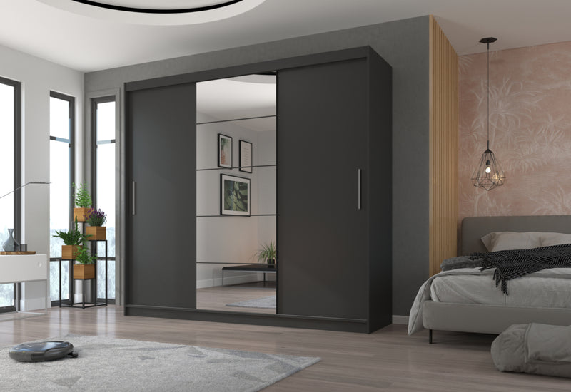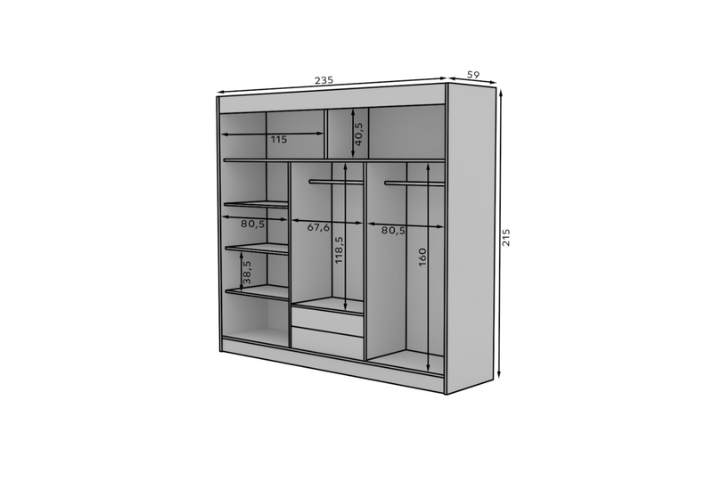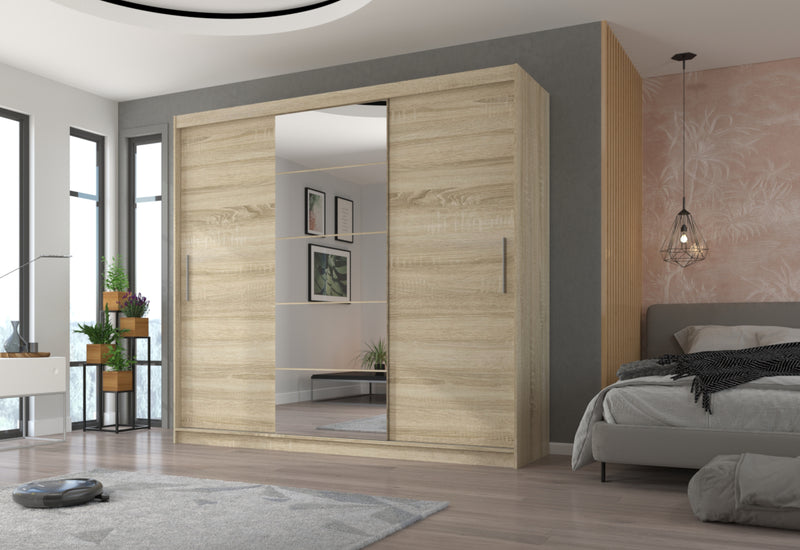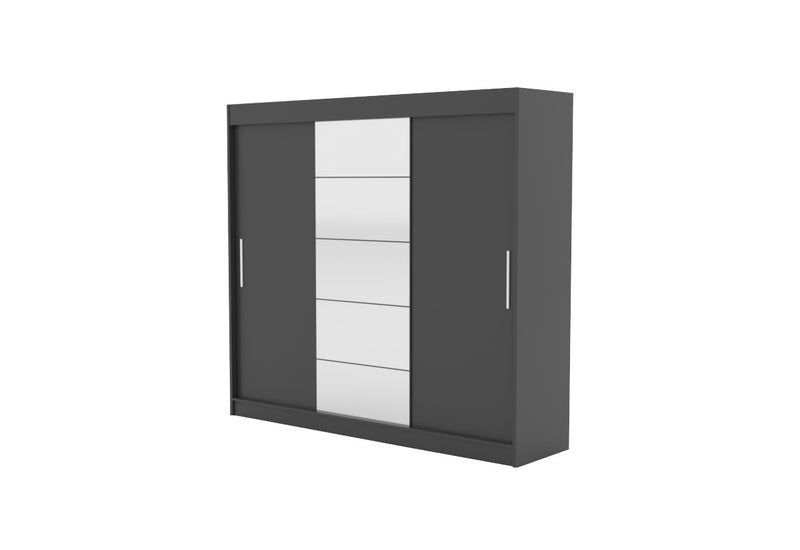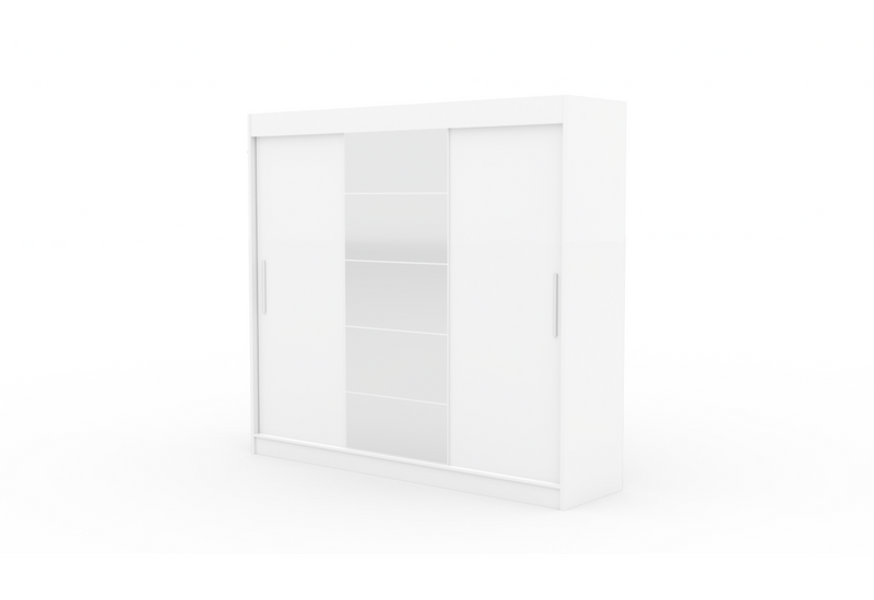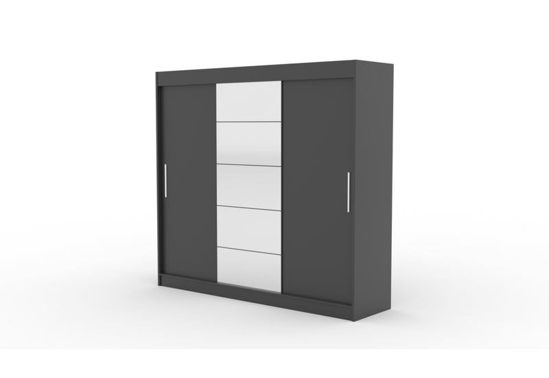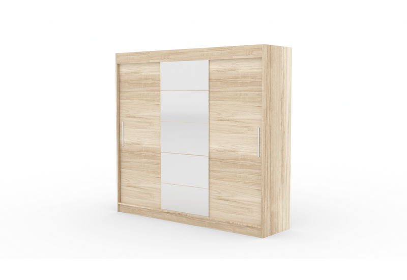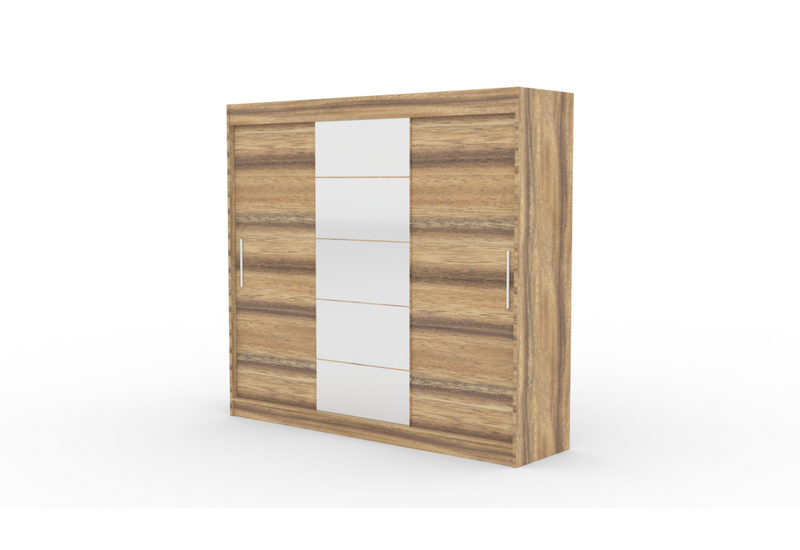 Posuvná šatníková skriňa MERWIN. Je vyrobená z kvalitného materiálu s hrúbkou 1,6 cm. Za posuvnými dverami sa ukrýva veľké množstvo úložného priestoru. Poskytne vám priestranné police a zároveň, šuplíky aj šatníkovú tyč. Pre ľahšie otvorenie sú dvere vybavené dlhou striebornou rukoväťou. Súčasťou skrine je aj zrkadlo. Možnosť výberu dekoru a rozmerov
