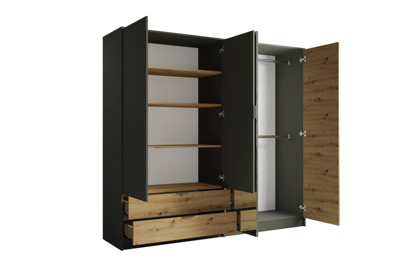 Šatníková skriňa MOLINE. Zaujme moderným dizajnom a kvalitným spracovaním. Je opatrená ABS hranami, ktoré ju chránia pred mechanickým poškodením a vlhkosťou. Skriňa poskytuje dostatok úložného priestoru v podobe dvoch šatníkových tyčí, troch políc a dvoch zásuviek. Jedny dvierka skrine sú doplnené zrkadlom. Na otváranie slúžia praktické úzke úchytky. Odporúčame kombinovať s ďalšími produktmi z kolekcie MOLINE.