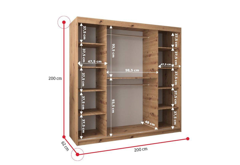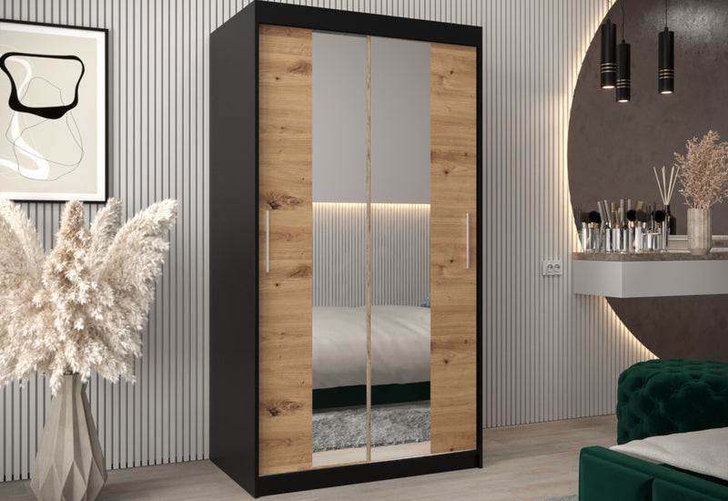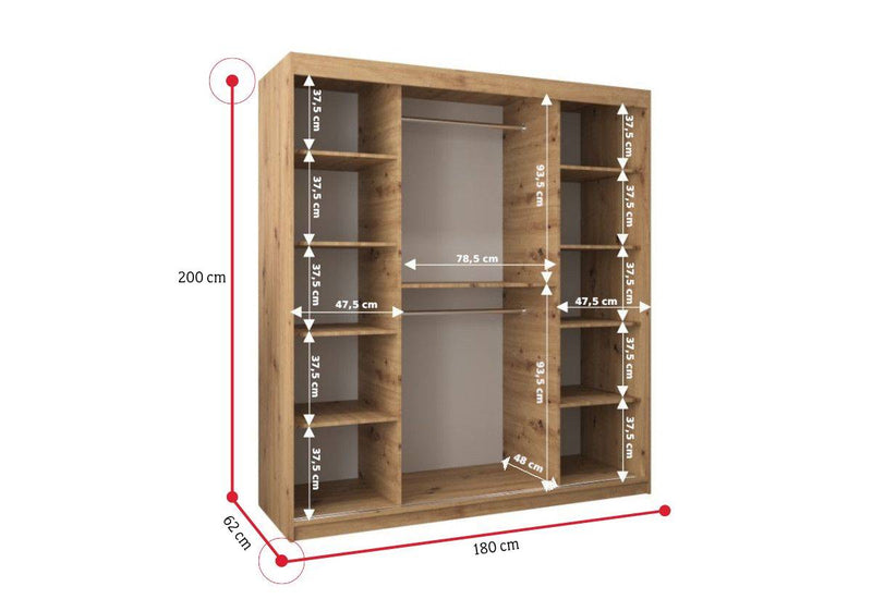 Šatníková skriňa MORI 3. Poskytne dostatok úložného priestoru v podobe šatníkových tyčí a niekoľkých políc. Skriňa je vyrobená z kvalitného materiálu s hrúbkou 1,6 cm. Súčasťou skrine je zrkadlo. Jednoduché otváranie pomocou posuvného systému. Možnosť výberu rôznych veľkostí a niekoľkých farebných variácií.