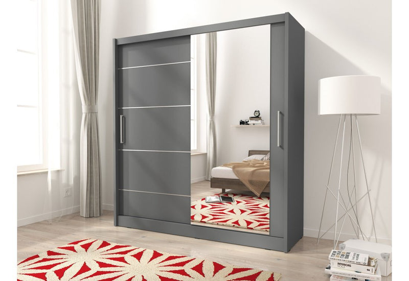 Šatníková skriňa NANA 1 ALU. Je vyrobená z kvalitného materiálu. Úložný priestor pozostáva z troch alebo šiestich políc na pravej strane, veľkého priestoru so šatníkovou tyčou a jednej alebo dvoch dlhých políc nad ním. Počet políc vždy závisí od zvoleného rozmeru. Šatníková skriňa s posuvnými dverami je k dispozícii vo viacerých dekoroch. Na jednej strane dverí je zrkadlo, druhá strana dverí je pevná s ozdobnými líniami.