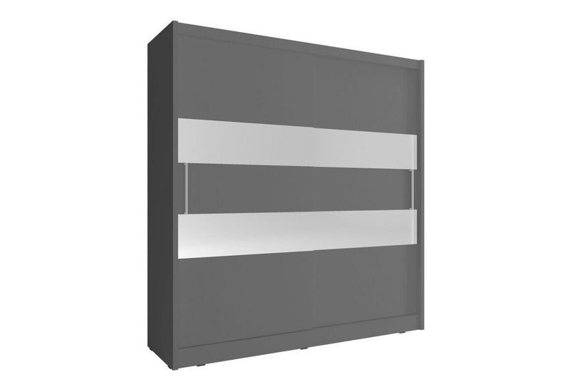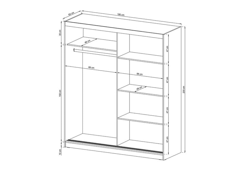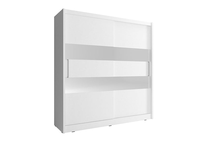 Šatníkova skriňa NANA 2. Je vyrobený z vysokokvalitného materiálu. Úložný priestor pozostáva z troch alebo šiestich políc na pravej strane, veľkého priestoru so šatníkovou tyčou a jednej alebo dvoch dlhých políc nad ním. Počet políc vždy závisí od zvoleného rozmeru. Šatníková skriňa s posuvnými dverami je k dispozícii v dvoch dekoroch. Posuvné dvere sú zdobené zrkadlovými pruhmi a jemnými úchytkami.
