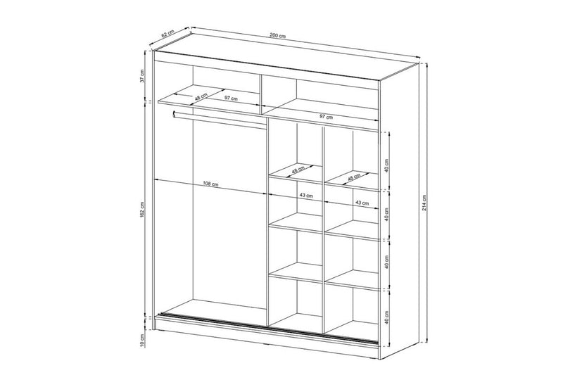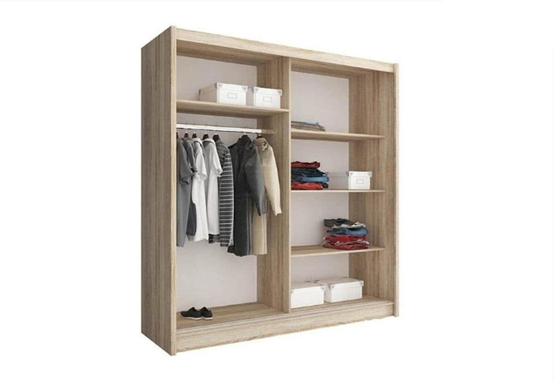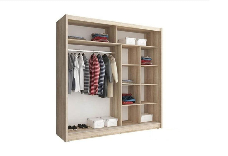 Šatníkova skriňa NANA 3. Je vyrobený z vysokokvalitného materiálu. Úložný priestor pozostáva z troch alebo šiestich políc na pravej strane, veľkého priestoru so šatníkovou tyčou a jednej alebo dvoch dlhých políc nad ním. Počet políc vždy závisí od zvoleného rozmeru. Šatníková skriňa s posuvnými dverami je k dispozícii v dvoch dekoroch. Jedna časť posuvných dverí je zdobená zrkadlovými pruhmi, dvere obsahujú tenké úchyty.