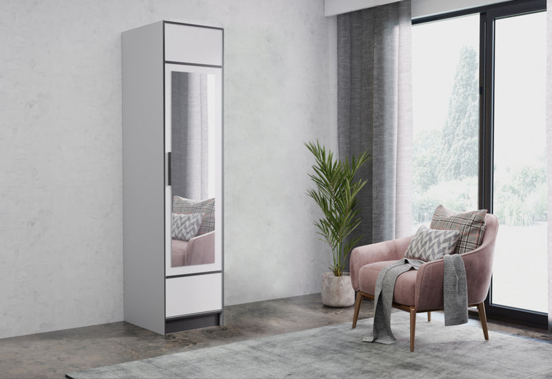Šatníková skriňa NORY. Šatníková skriňa zaujme svojim jednoduchým dizajnom. Vyrobená je z kvalitného materiálu s hrúbkou 1,6 cm. Skriňa je vo vnútri rozdelená na niekoľko políc a vďaka tomu obsahuje dostatok úložného priestoru. Jednoduché otváranie zaistia plastové úchytky. Súčasťou skrine je aj zrkadlo. Možnosť voľby z viacerých dekorov.