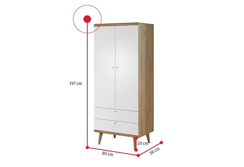 Šatníková skriňa PORT PSZ80. Je vyrobený z vysokokvalitného materiálu. Dvojdverová šatníková skriňa stojí na vysokých nožičkách v prírodnom dekore. Šatníková skriňa obsahuje dve zásuvky a priehradku so šatníkovou tyčou. Dvierka a zásuvky sú vybavené malými úchytkami. Dizajn v prírodnom dekore v kombinácii s bielou je vkusný a elegantný.
