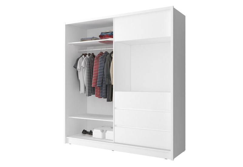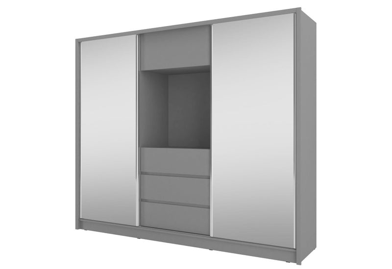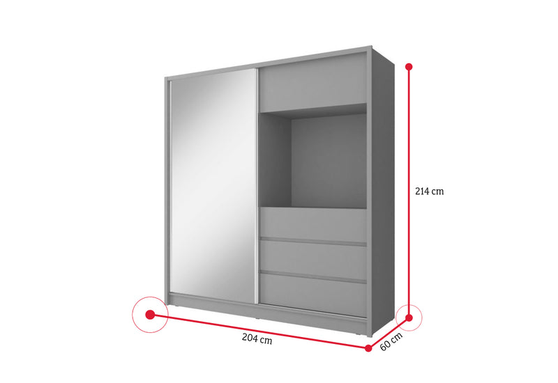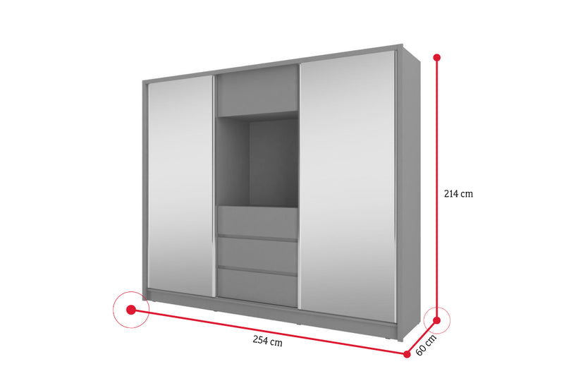 Šatníková skriňa s TV. Je vyrobená z vysokokvalitného materiálu. Usporiadanie vnútorného priestoru je riešené závesnou tyčou a policami. Vonkajšia časť skrinky je doplnená priehradkou na TV a zásuvkami. Priestor pre televízor má rozmery 82x83 cm alebo 82x98 cm v závislosti od vybraného modelu. V hornej časti skrinky sa nachádzajú police. Šatníková skriňa má posuvné dvere v ktorých je zabudované veľké zrkadlo. Môžete si vybrať z dvoch dekorov a rozmerov.