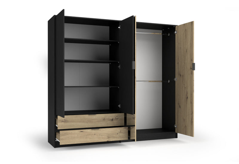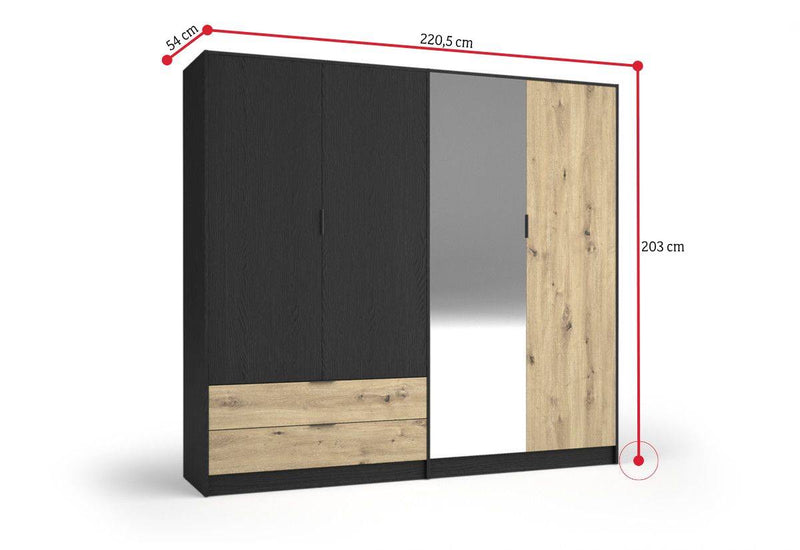 Šatníková skriňa SALAS. Skriňa Vás zaujme jednoduchými líniami moderného štýlu. Je vyrobená z kvalitného materiálu, ktorý je opatrený ABS hranou. ABS hrana chráni materiál pred mechanickým poškodením. Vnútorné usporiadanie štvordverovej skrine ponúka dostatok úložného priestoru v podobe políc a šatníkovej tyče. Skriňa obsahuje aj dve zásuvky. Súčasťou skrine je zrkadlo. Jednoduchšie otváranie zaistí úchytky. Vďaka svojmu vzhľadu nájde miesto v každom interiéri. Produkt môžete doplniť ďalšími produktmi z radu SALAS.