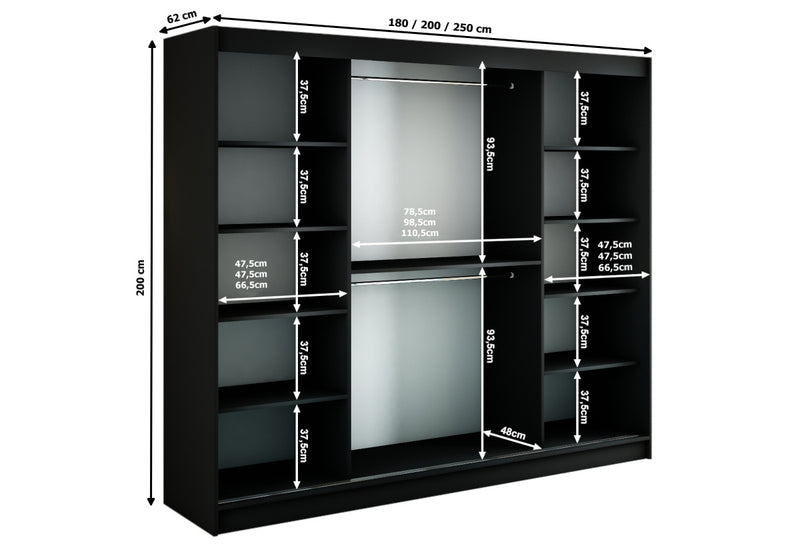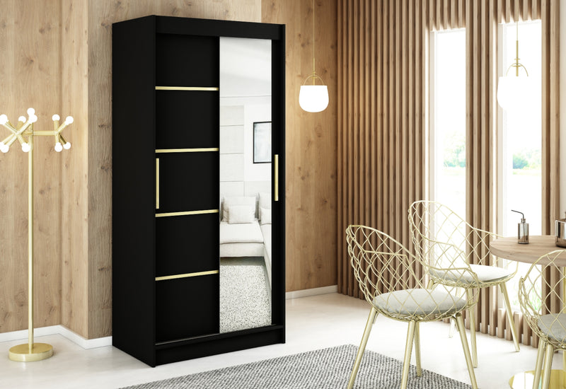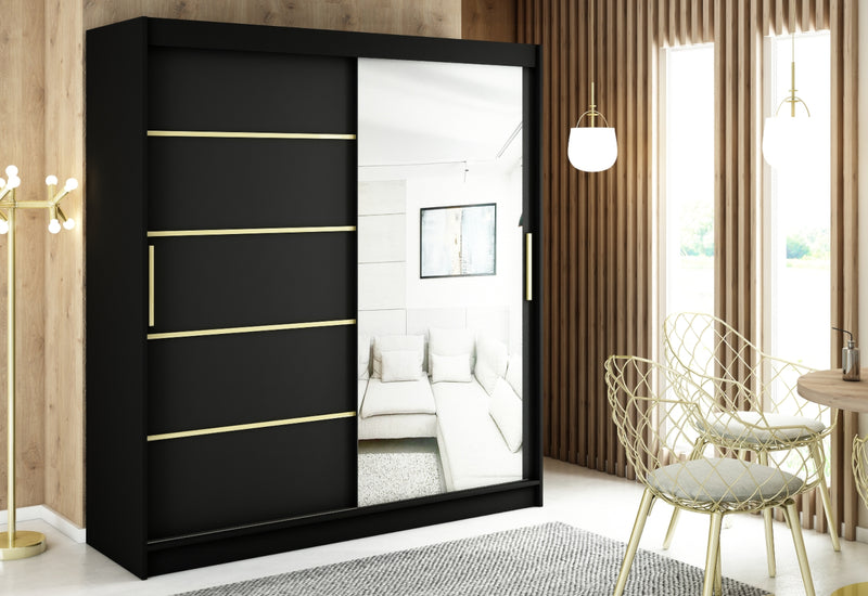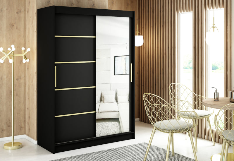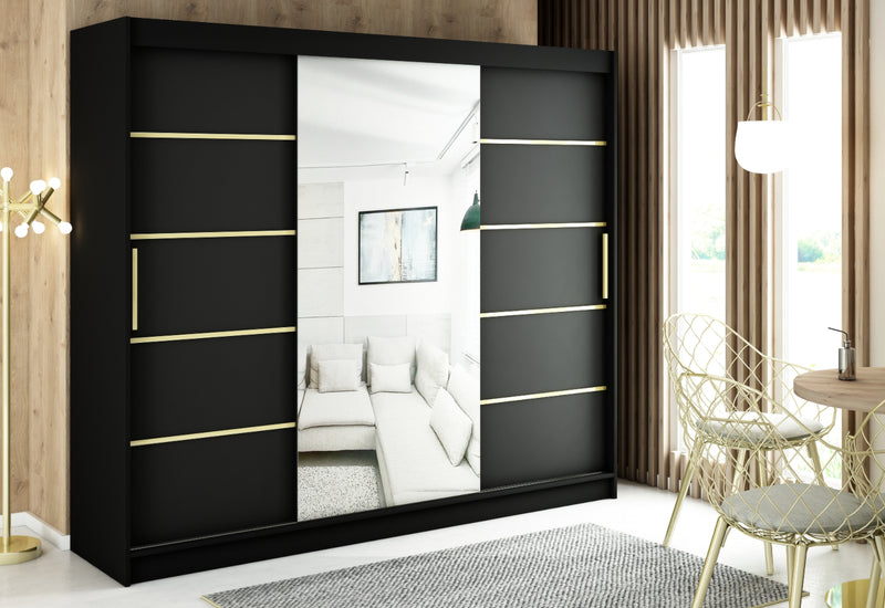 Šatníková skriňa SALI 4. Elegantná skrinka je vyrobená z kvalitného materiálu s hrúbkou 1,6 cm. S obrubou, ktorá chráni materiál pred mechanickým poškodením a vlhkosťou. Kľučky dverí sú v matnej zlatej farbe. Šatník ponúka dostatok úložného priestoru, je vybavený policami a šatníkovou tyčou. Posuvné dvere šatníka sú vybavené koľajničkami, ktoré uľahčujú otváranie dverí. Dvere skrine sú doplnené zrkadlom a počet políc sa líši podľa šírky skrine.