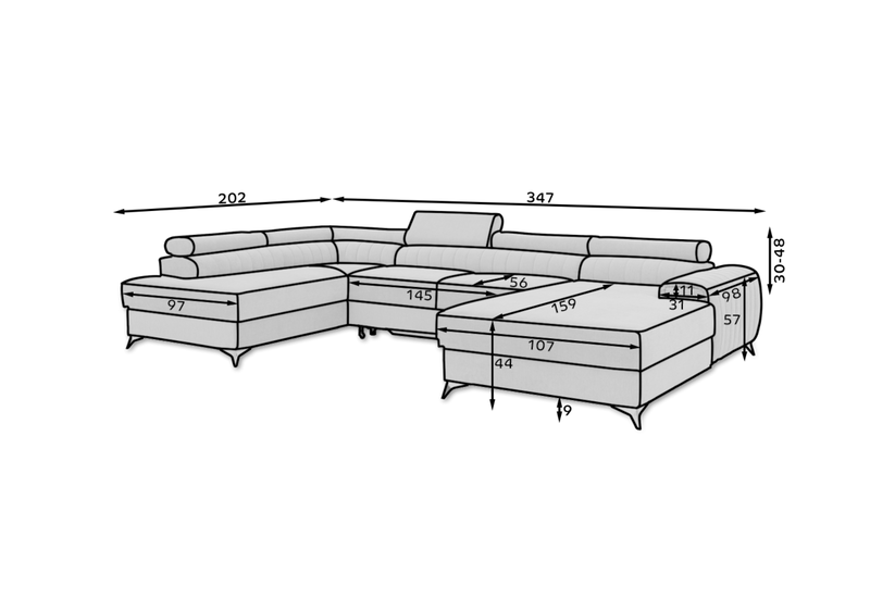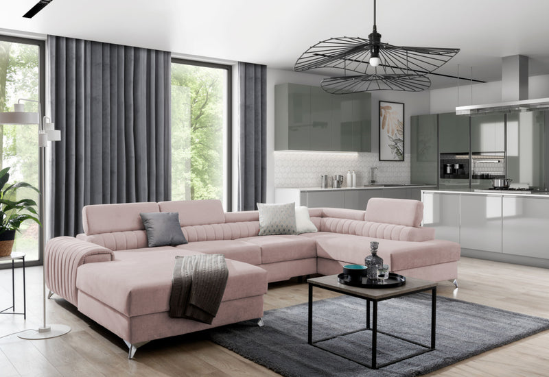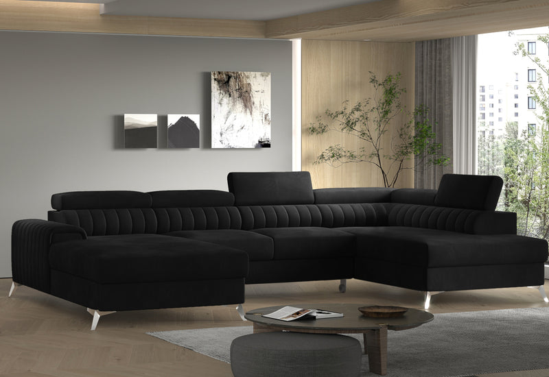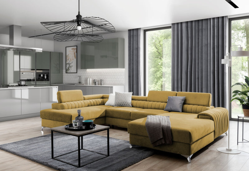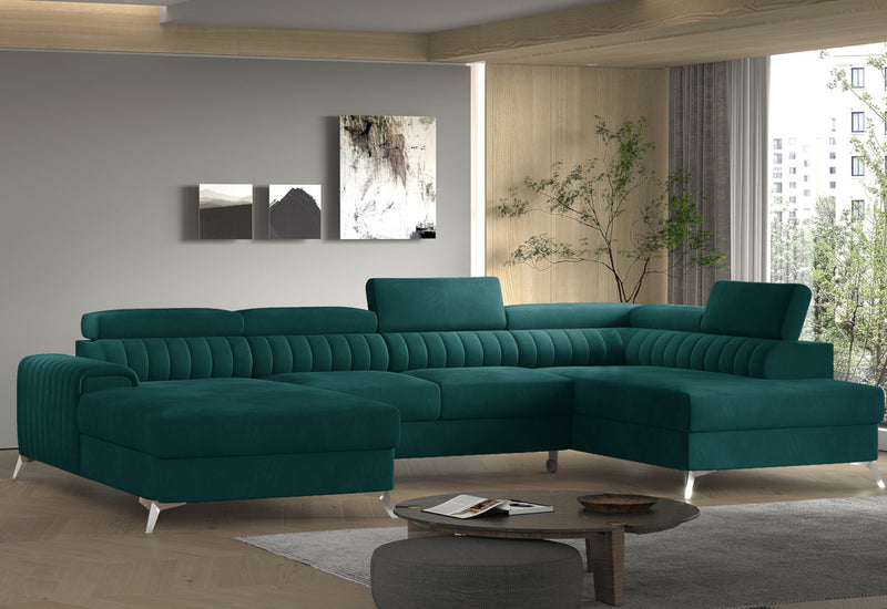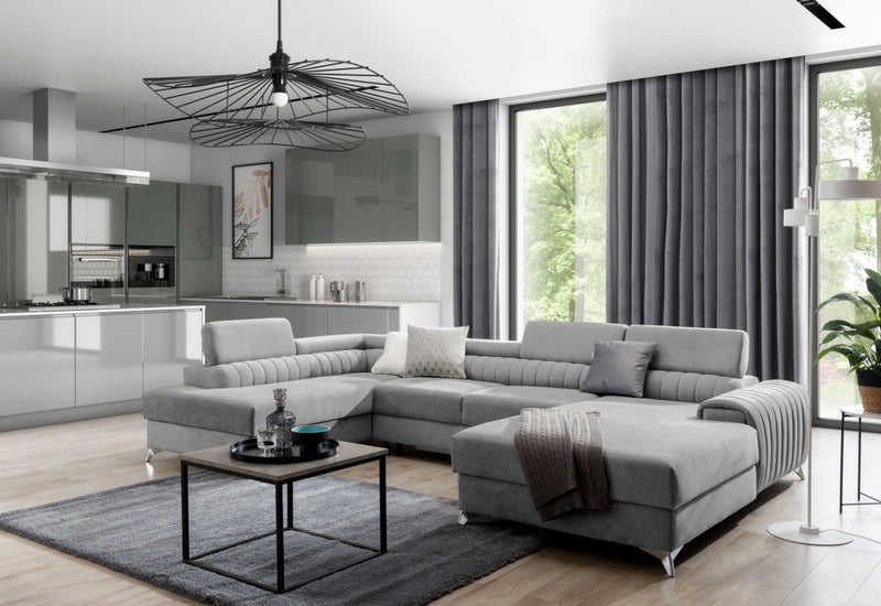 Sedacia súprava do U CANTE. Elegantná moderná sedacia súprava do U, ktorá vás zaujme na prvý pohľad. Pohovka je vyplnená kvalitnou HR penou s tvrdosťou T30, ktorá ponúka pohodlie pri odpočinku a relaxácii. Sedacia súprava je celočalúnená, takže aj v priestore bude vyzerať krásne. Veľkou výhodou sú tiež polohovateľné opierky hlavy. Sedacia súprava je rozkladacia a ponúka ďalej aj úložný priestor. Stojí na oceľových nožičkách, ktoré zaistia stabilitu. Vybrať si môžete z viacerých dekorov a orientácii rohu.