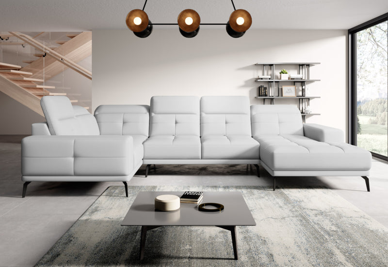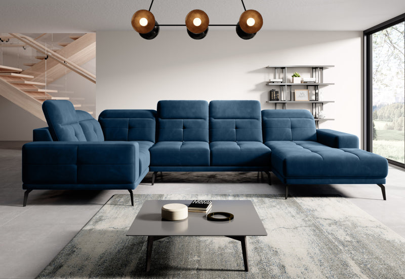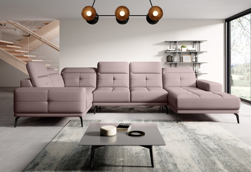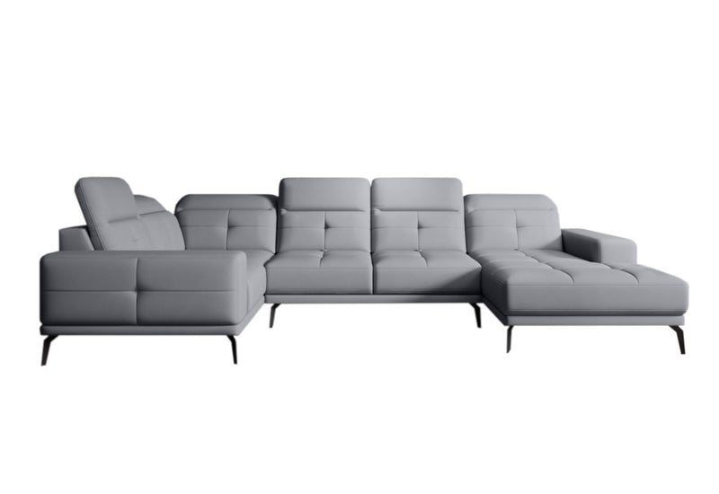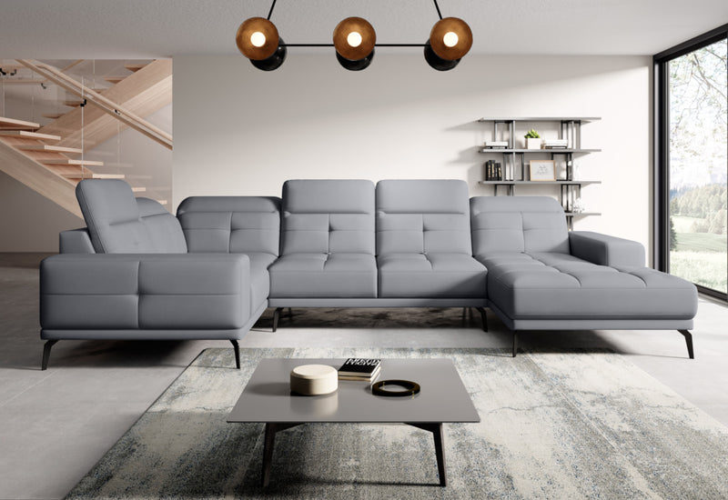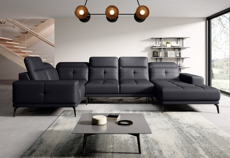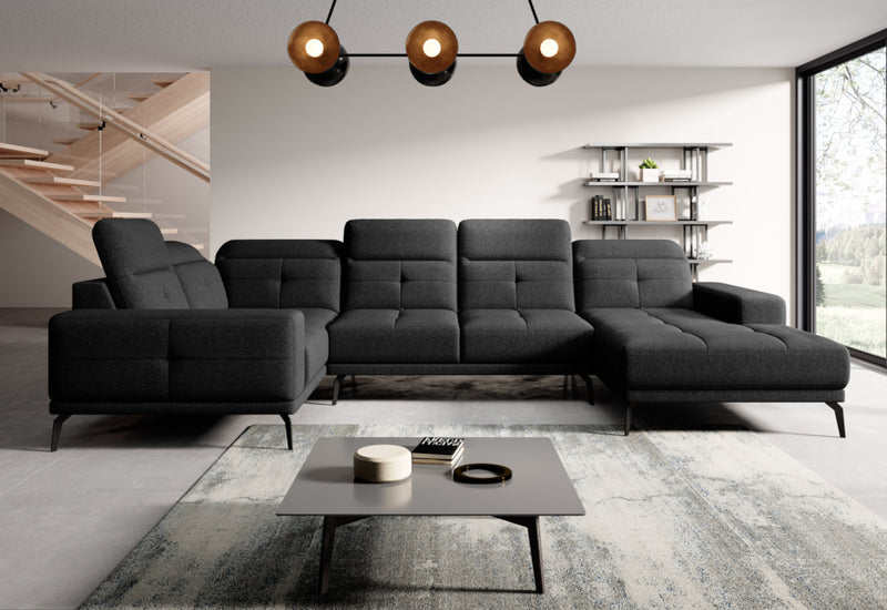 Pohovka v tvare U NAVARO. Zapôsobí svojím jednoduchým dizajnom. Pohovka je vyplnená kvalitnou HR penou s tvrdosťou T21/T25, ktorá poskytuje pohodlie pri odpočinku a relaxácii. Pohovka je celočalúnená, takže bude v priestore vyzerať krásne. Veľkou výhodou sú aj nastaviteľné opierky hlavy. Stabilitu zabezpečujú čierne oceľové nohy. Môžete si vybrať z viacerých dekorov a orientácie rohov.