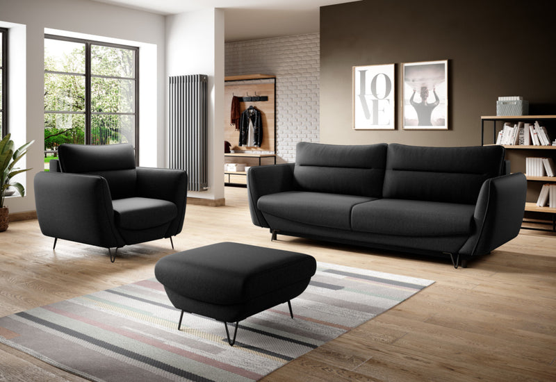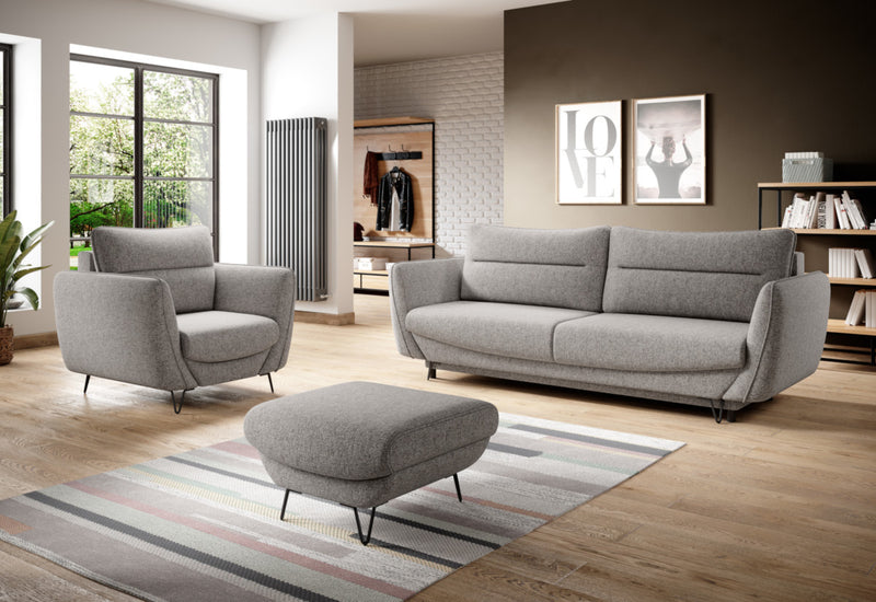 Sedacia súprava SELIVA. Zapôsobí jednoduchými líniami. Sedacia súprava je vyplnená kvalitnou HR penou, ktorá poskytuje pohodlie pri odpočinku a relaxácii. Veľký priestor na sedenie ponúka kreslo, taburetka a rozkladacia pohovka, ktorú možno ľahko premeniť na posteľ. Elegantne tvarované nohy. V pohovke sa nachádza úložný priestor. Výber poťahových látok príjemných na dotyk.