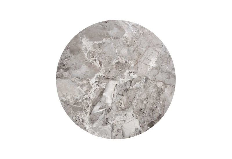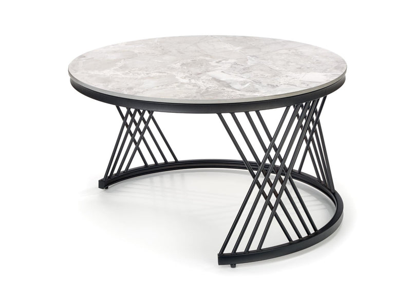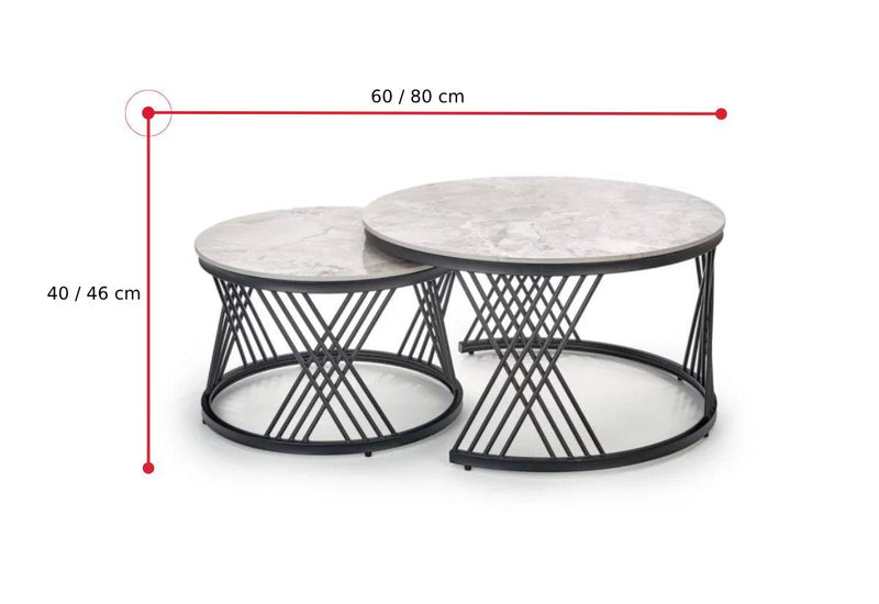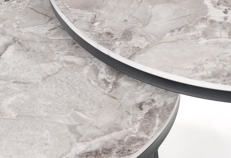 Set konferenčných stolíkov AMINGO. Dosky setu konferenčných stolíkov v okrúhlom tvare sú vyrobené z kameňa v dekore šedý mramor. Poskytuje dostatočný odkladací priestor. Položené sú na kovových konštrukciách. Tento set konferenčných stolíkov sa skladá z dvoch okrúhlych stolíkov s odlišnými rozmermi. Vytvára netradičný a zároveň originálny dizajn.