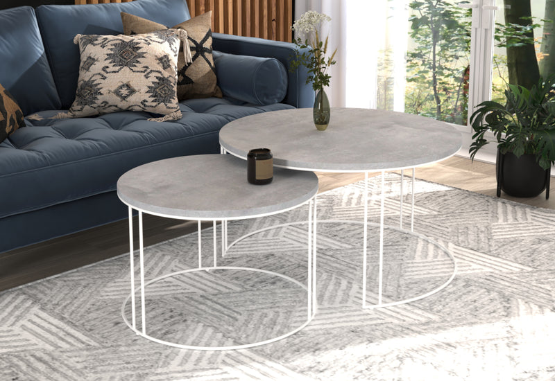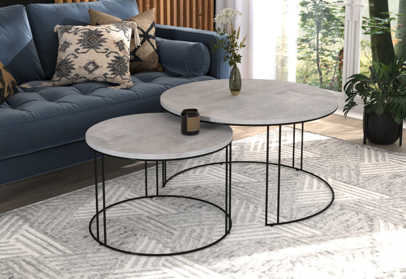 Set konferenčných stolíkov ETA. Dosky Setu konferenčných stolíkov v okrúhlom tvare sú vyrobené z kvalitného materiálu s hrúbkou 1,8 cm. Poskytujú dostatočný odkladací priestor. Položené sú na pevných kovových konštrukciách. Tento Set konferenčných stolíkov sa skladá z dvoch okrúhlych stolíkov s odlišnými rozmermi, vytvára netradičný a zároveň originálny dizajn. Možnosť výberu z viacerých dekorov.