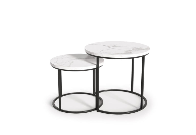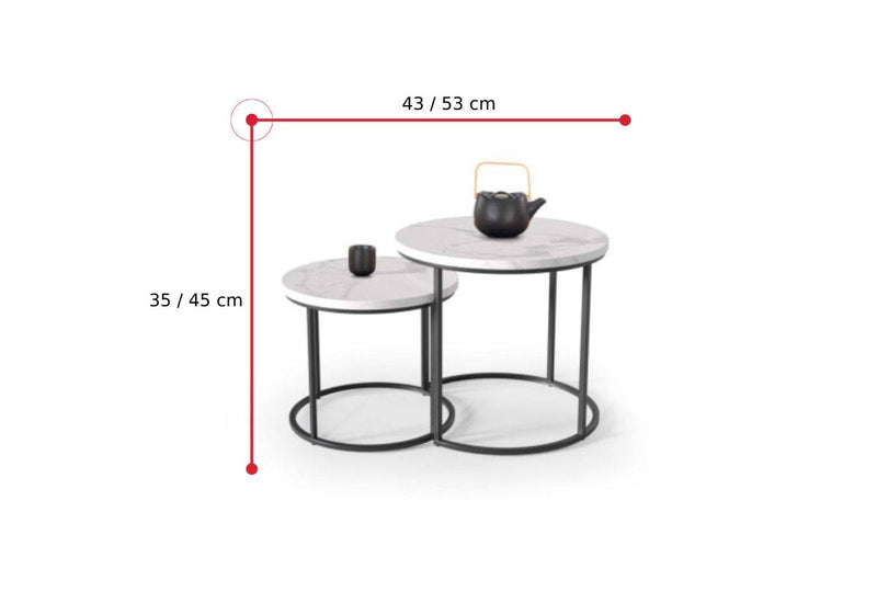 Set konferenčných stolíkov KORELO. Skladá sa z dvoch okrúhlych stolíkov s odlišnými rozmermi. Na kovovej konštrukcii čiernej farby sú položené dosky, ktoré sú vyrobené z kvalitnej dyhovanej MDF. Menší stolček ľahko zasuniete pod ten väčší. Kombinácia použitých materiálov pôsobí vzdušne a ľahko. Vďaka industriálnemu štýlu nájde svoje využitie v obývacích priestoroch alebo na terase. Možnosť výberu z viacerých dekorov.